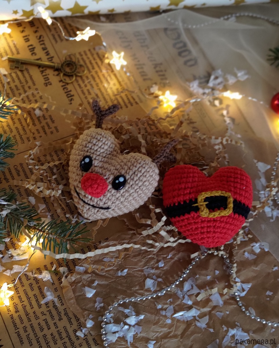 - Zestaw zawiera: serce w kolorkach ubrania Mikołaja - czerwone z czarnym paskiem serce i beżowe serce renifer z czerwonym nosem i brązowymi rogami.