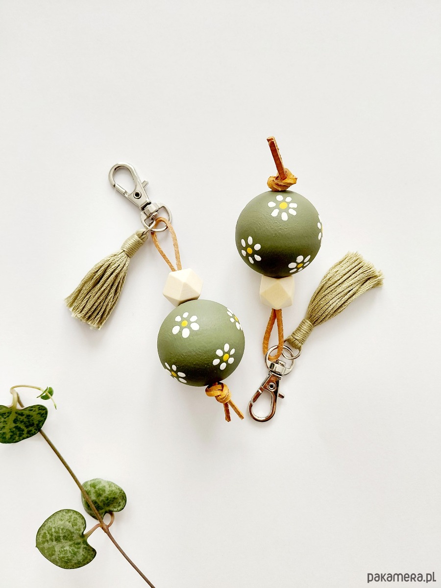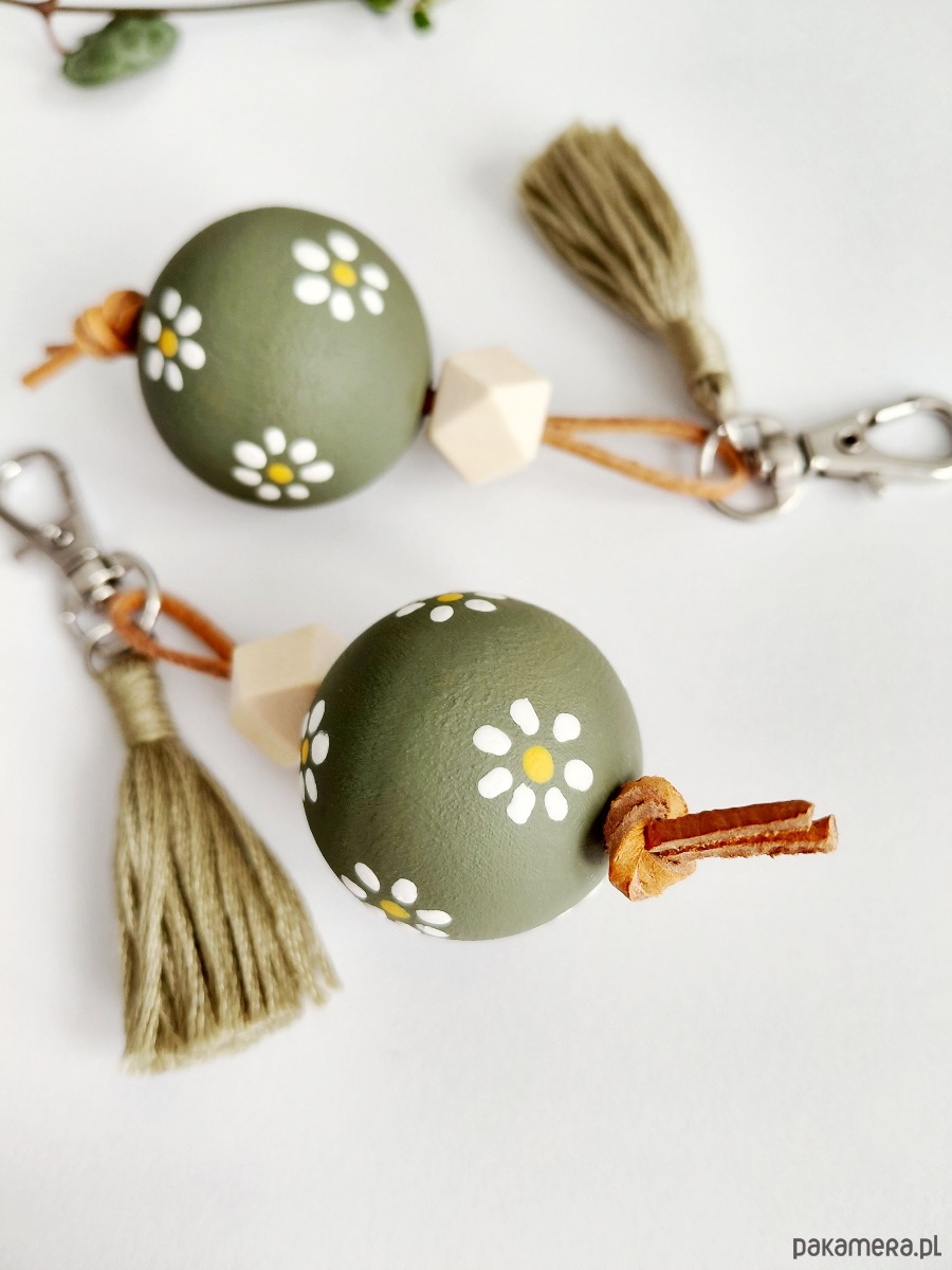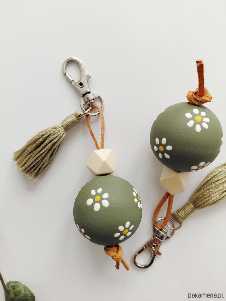 Breloki wykonane z elementów drewnianych malowanych i zabezpieczonych lakierem.