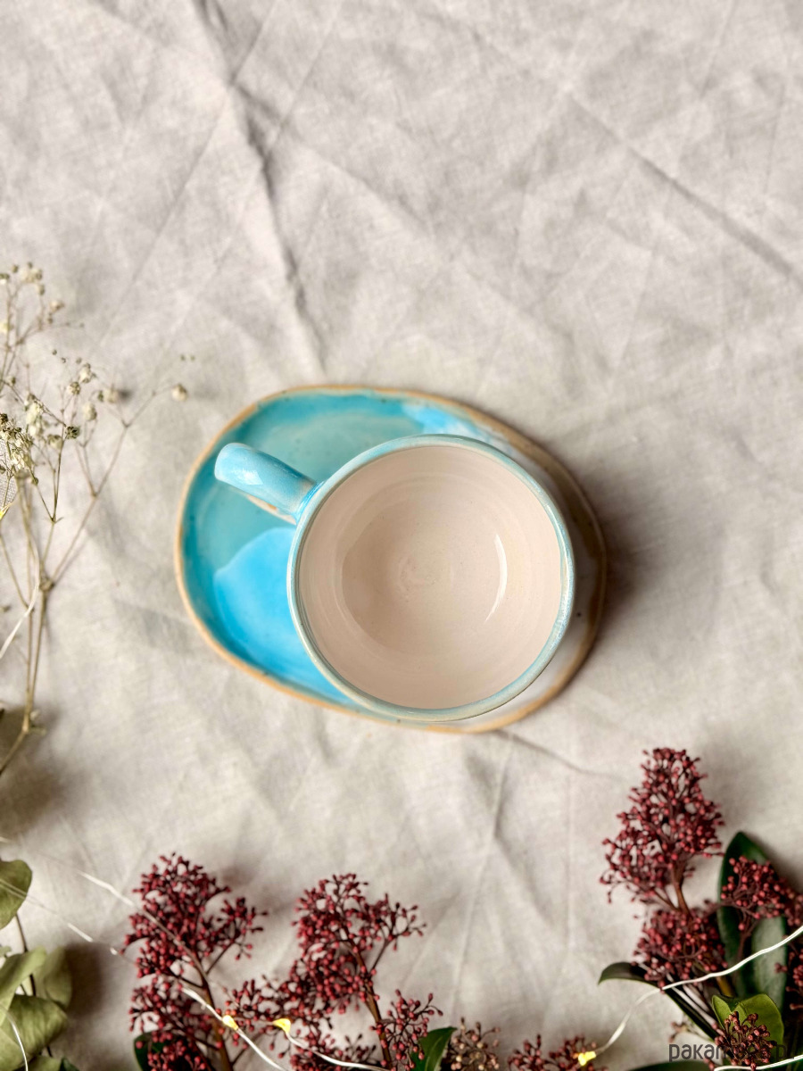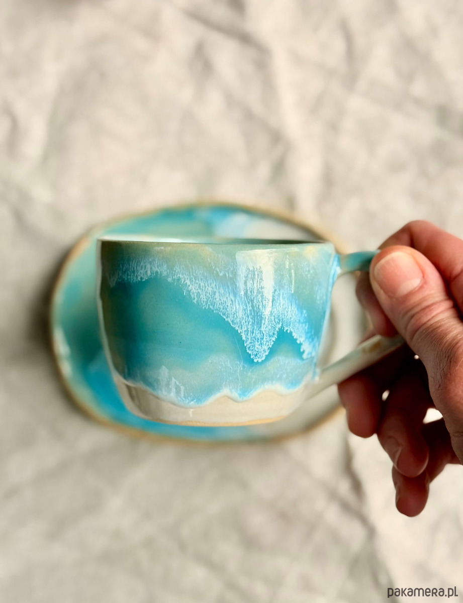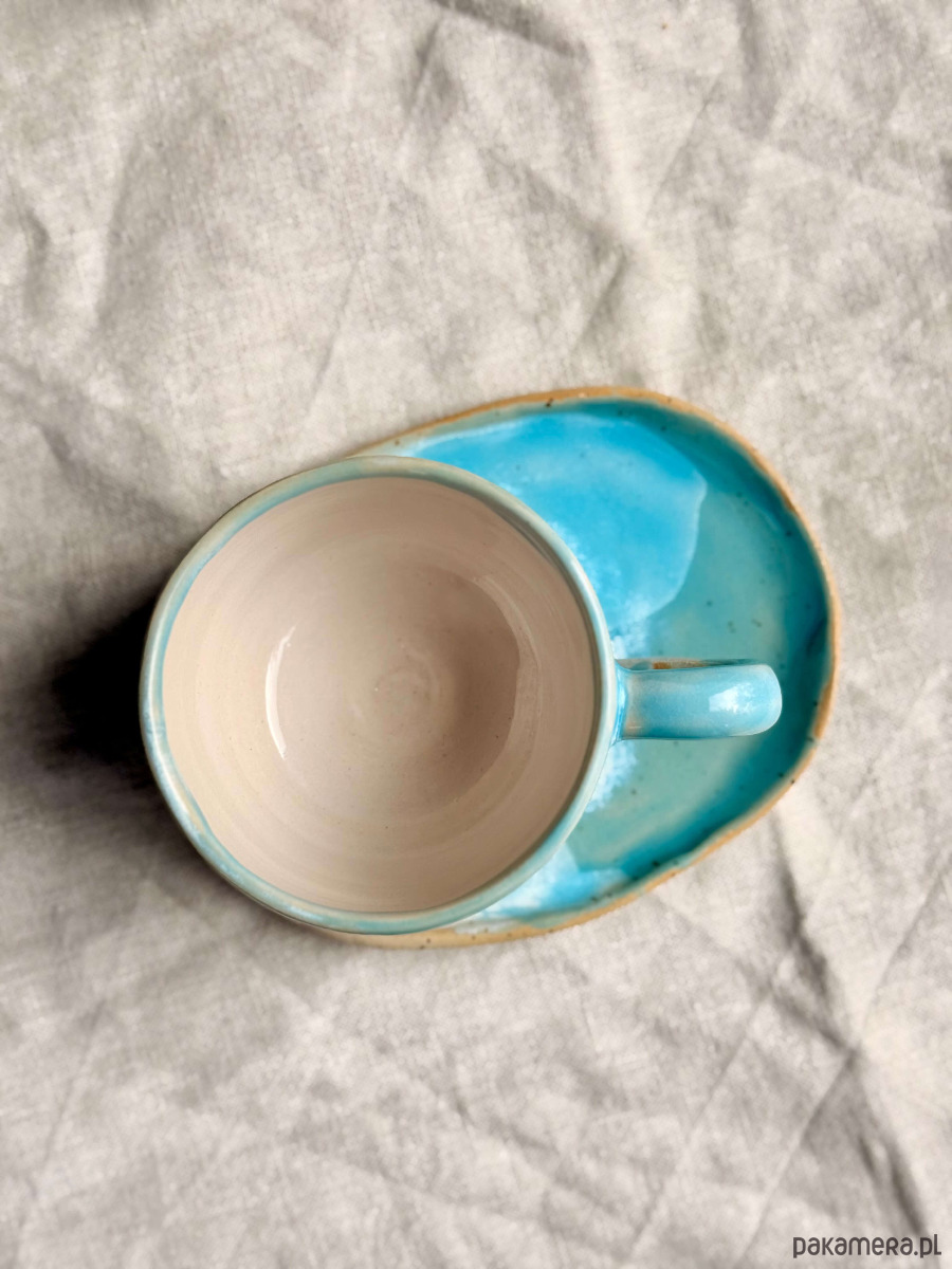 Filiżanka i spodek wykonane ręcznie z jasnej gliny w kropki. Każda sztuka wyjątkowa i niepowtarzalna.