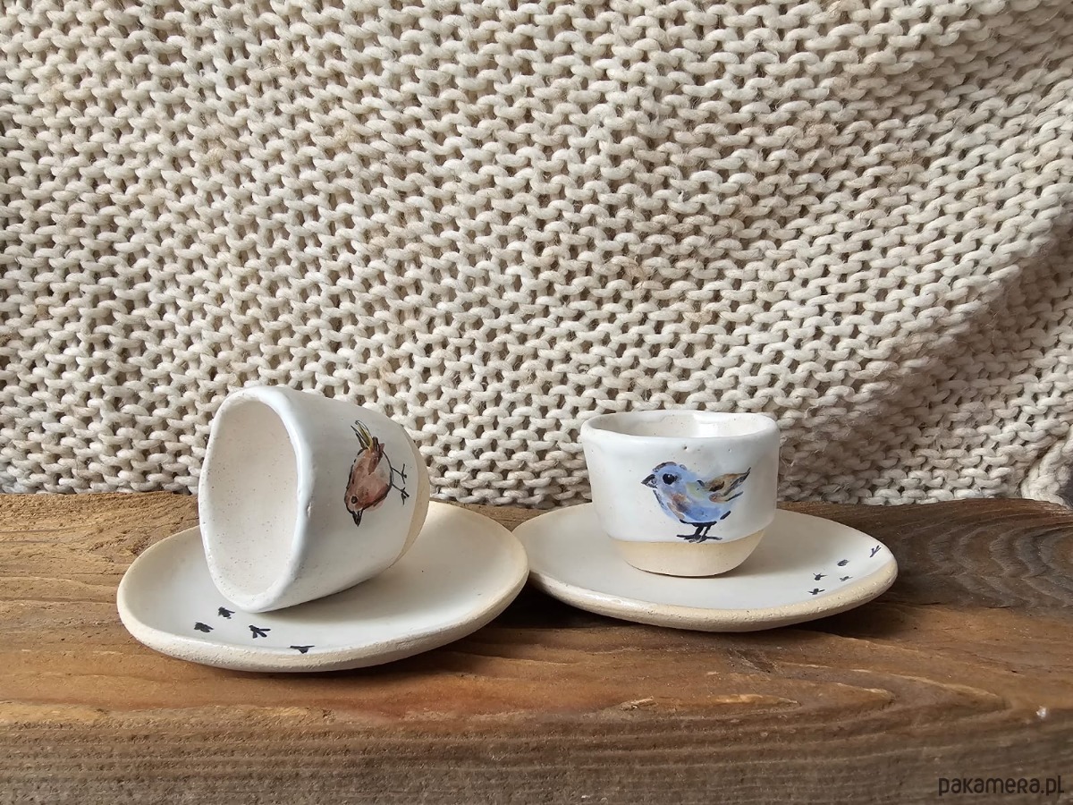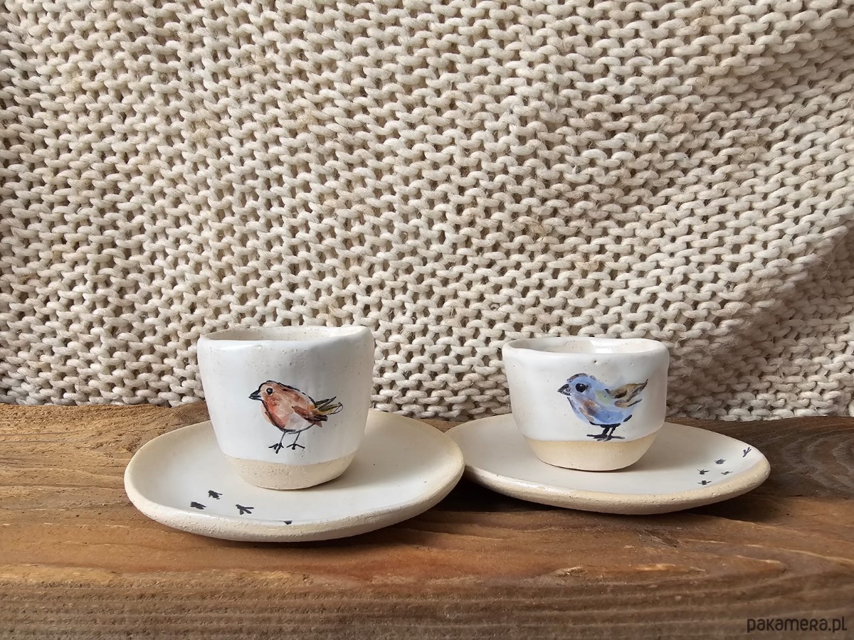 Zestaw ceramicznych kieliszków na jajka z talerzykami handmade
