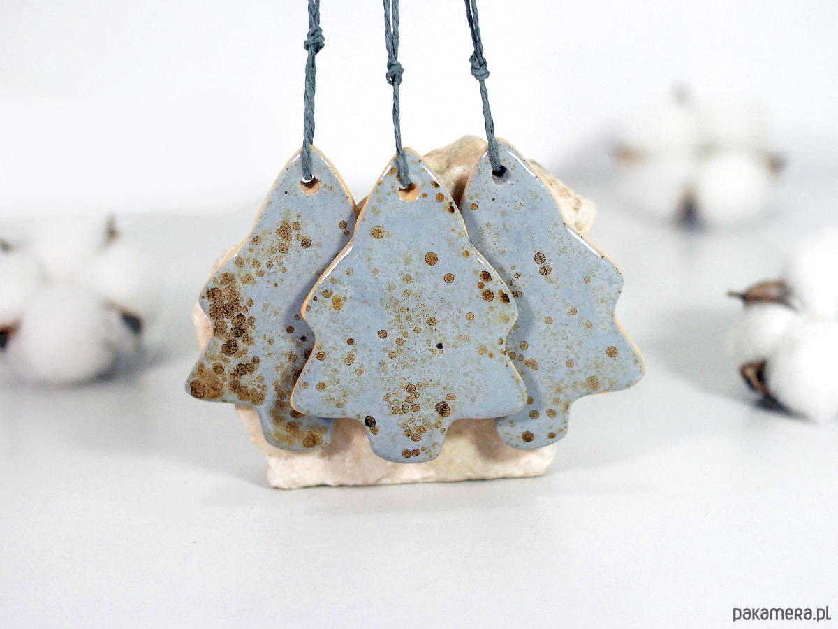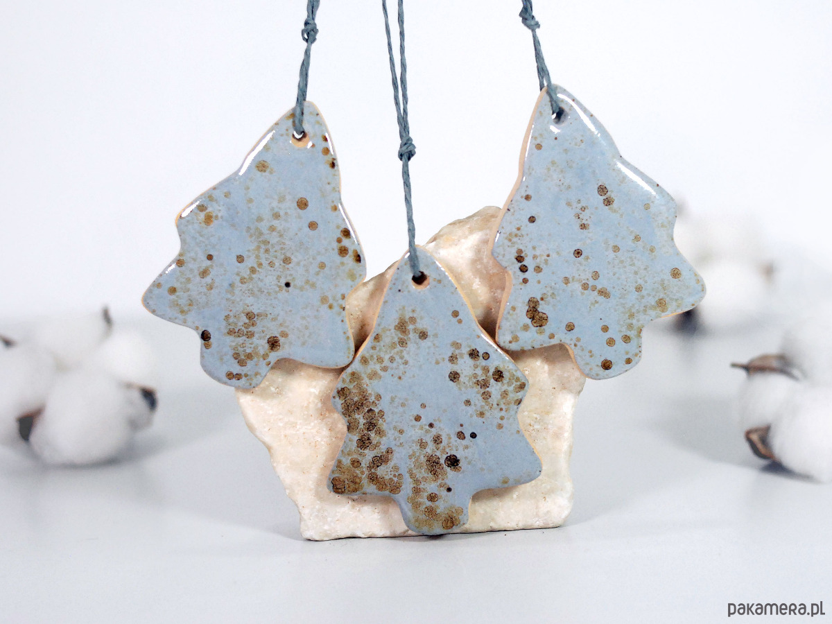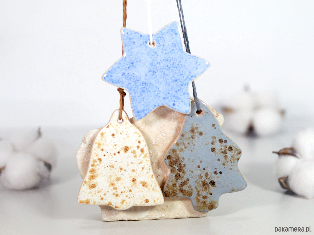 Komplet zawiera trzy ceramiczne ozdoby - choinka, gwiazdka, dzwonek.