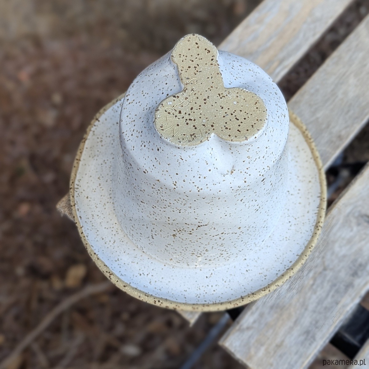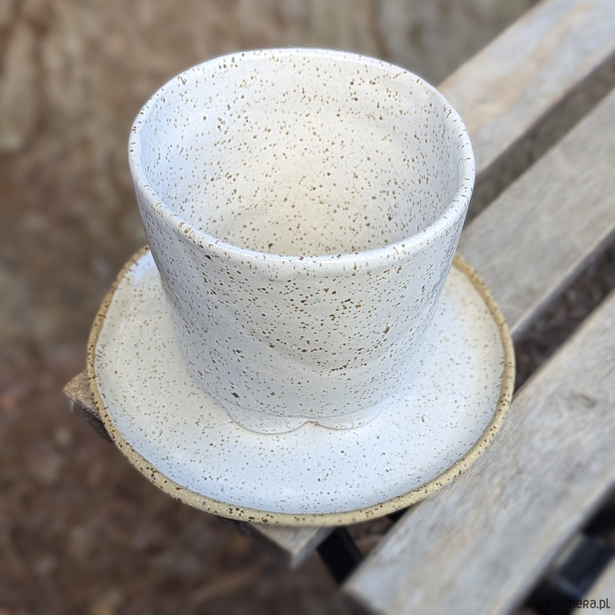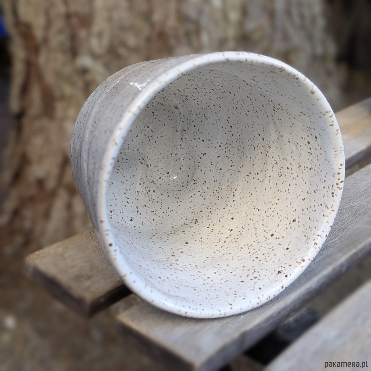 Kubek pokryty błyszczącym, białym szkliwem. Każdy jest unikalny.