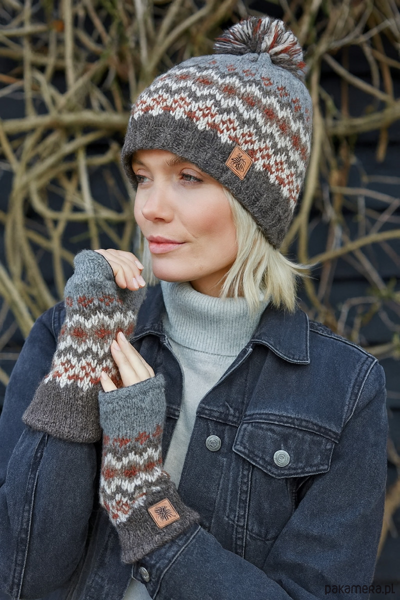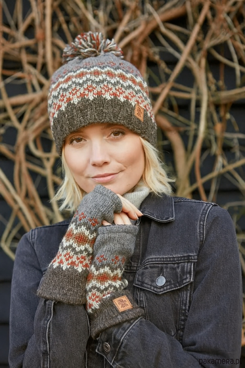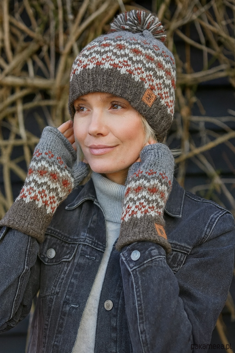 Nasz komplet - czapka i ocieplacze na dłonie wykonany jest ze 100% nowozelandzkiej wełny owczej w kolorze brązowo szarym. Czapka typu beanie z pomponem jest częściowo podszyta opaską polarową wokół głowy i uszu, a ocieplacze na dłonie są w całości wyłożone polarem, dzięki czemu wszystko jest piękne i ciepłe, gdy jesteś poza domem.