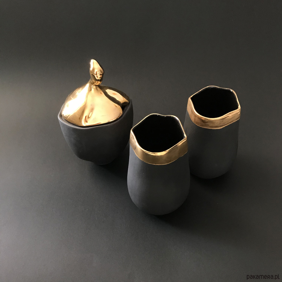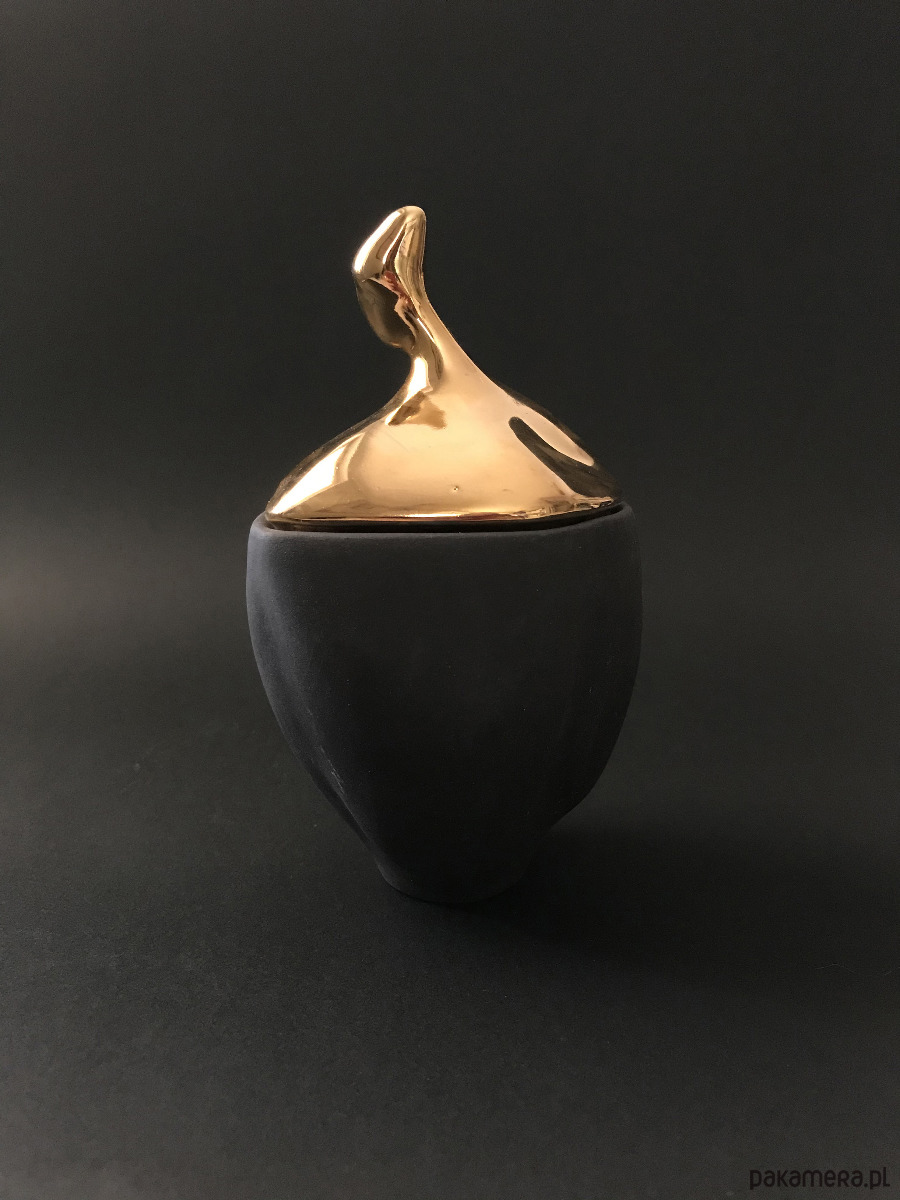Jest to projekt autorski tzn że sama zaprojektowałam kształt tych kubków i cukiernicy, sama je odlewałam z własnoręcznie barwionej kamionki w swojej małej pracowni we Wrocławiu i sama malowałam je szlachetnym złotem. Teraz prosto z moich rąk mogą trafić w Twoje by wędrować dalej i dawać miłość Twoim bliskim. Kupując ten produkt wspierasz moją twórczość, polski design i polskie rzemiosło.
