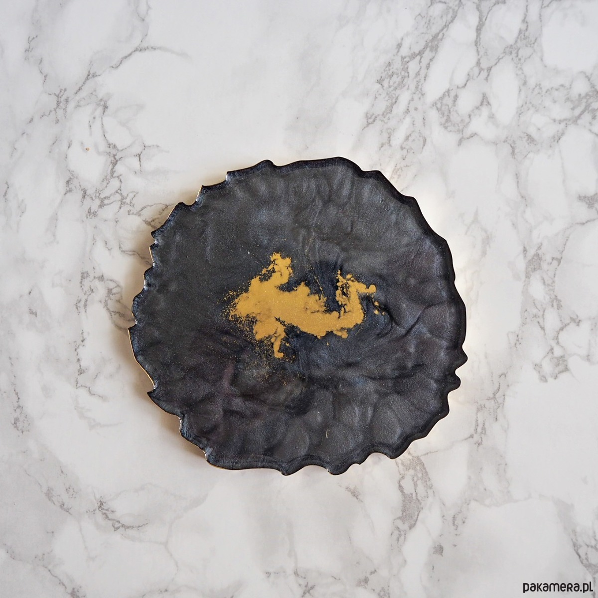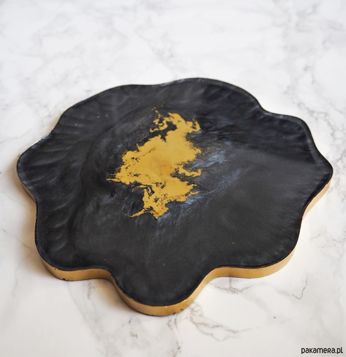 Zestaw 6 czarnych podkładek z rozlanym złotem o falistych kształtach oraz czarna patera z rozlanym złotem.