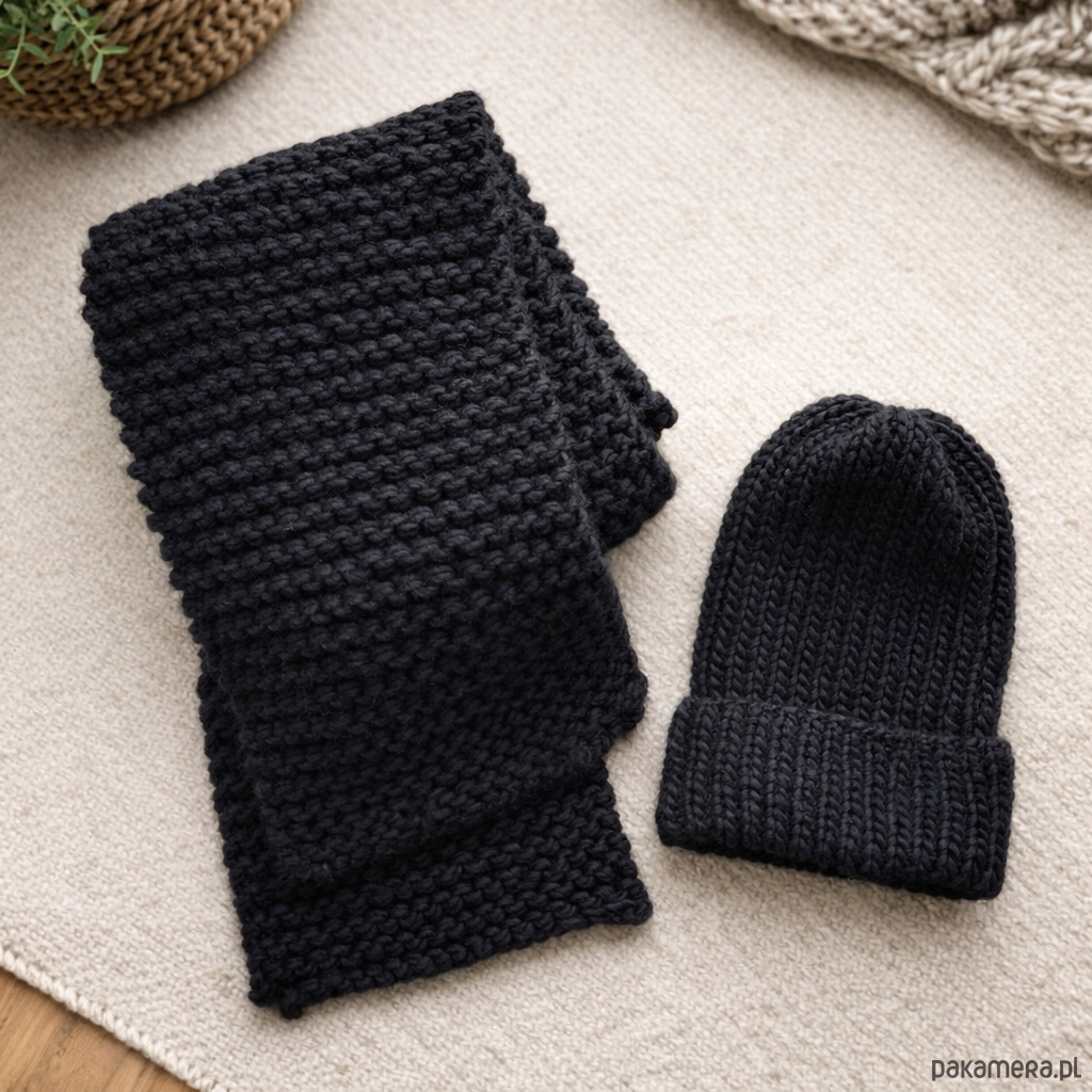 Zestaw czarny czapka szalik miękka i ciepła wełna handmade