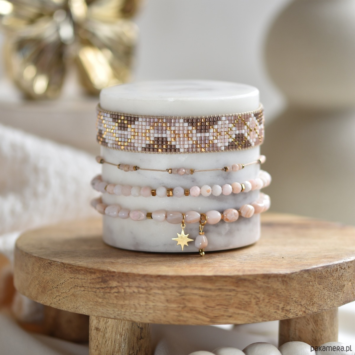 Zestaw 4 eleganckich bransoletek w subtelnych odcieniach pudrowego różu, beżu i złota to kwintesencja delikatności i kobiecego stylu. Dominującym kamieniem w tym zestawie jest opal, który zachwyca swoim mlecznym blaskiem i nadaje biżuterii wyjątkowo szlachetnego charakteru.