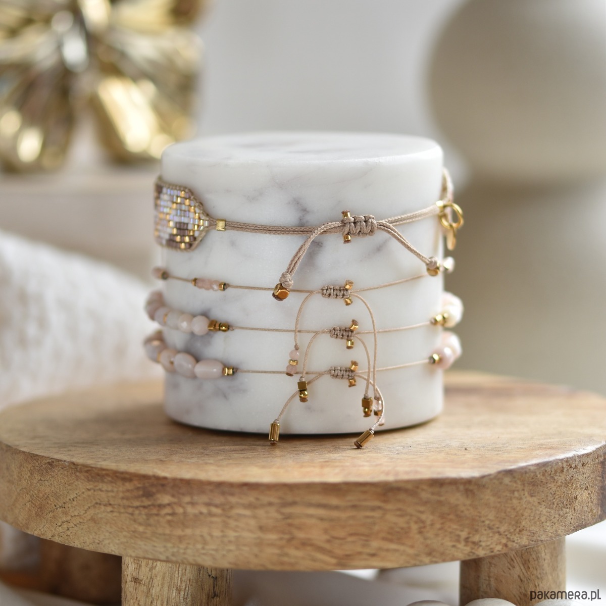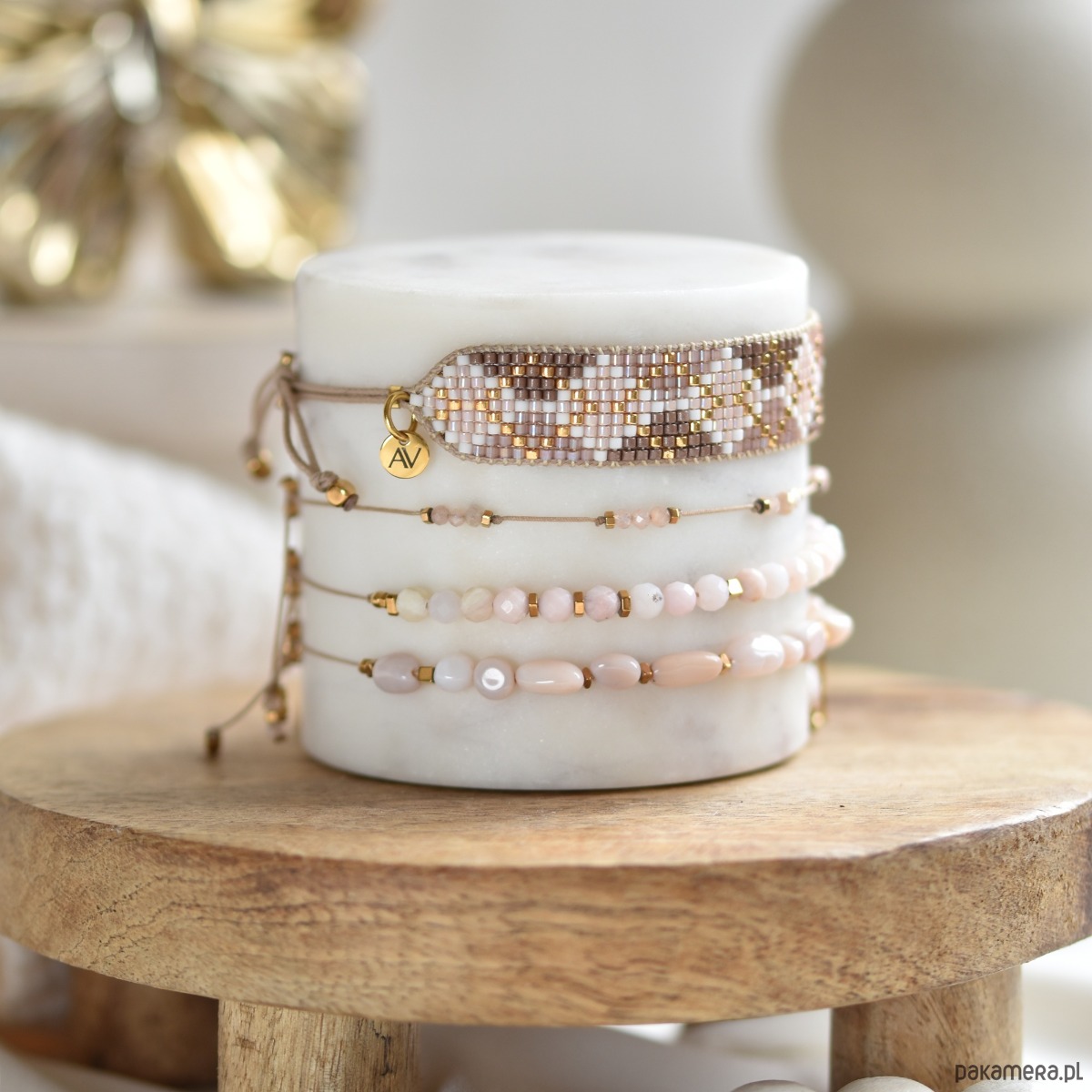 – ręcznie tkana na krośnie bransoletka w odcieniach złota i pastelowego różu (szerokość ok. 1,4 mm), która przyciąga uwagę i dodaje całości elegancji