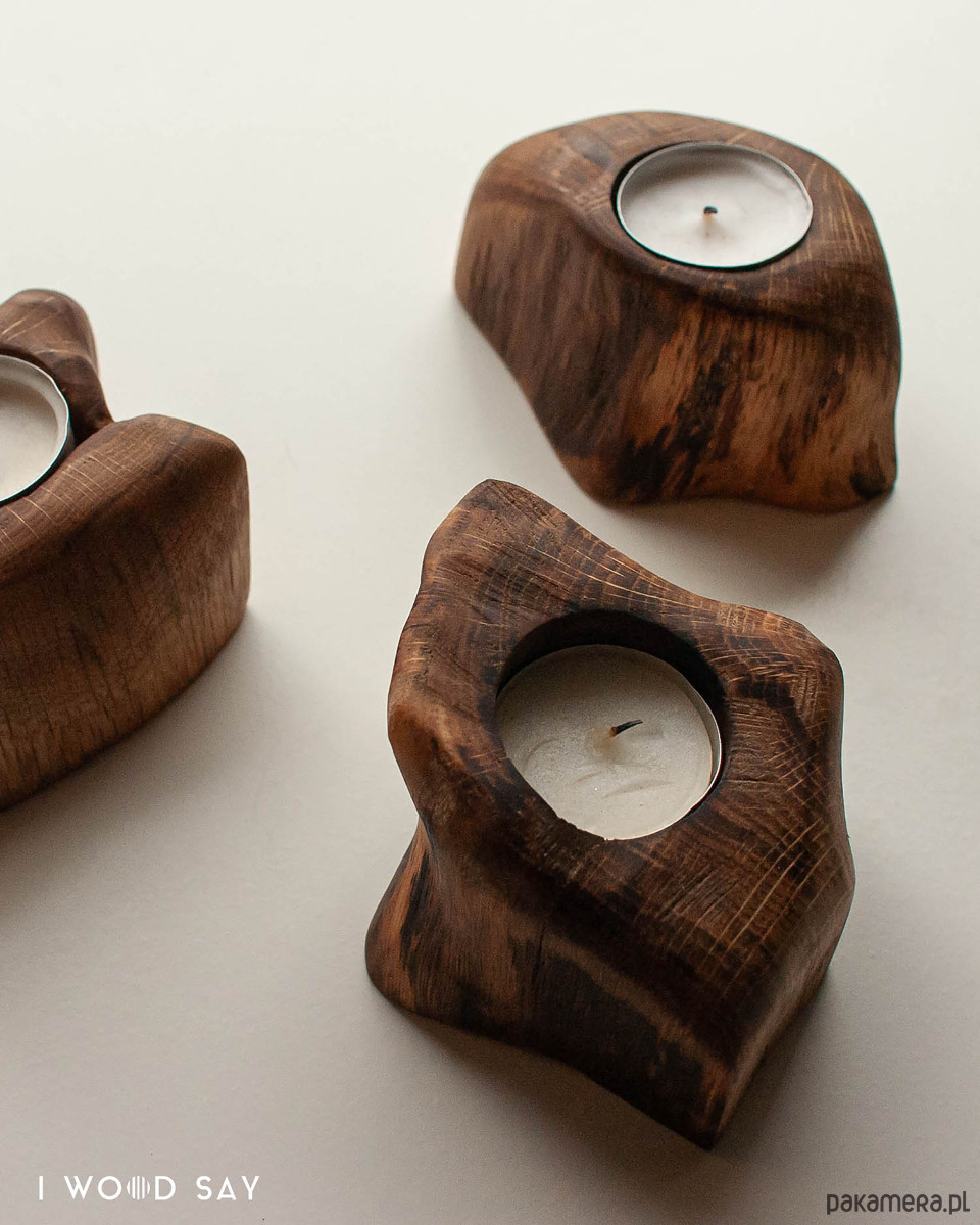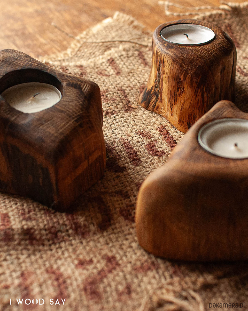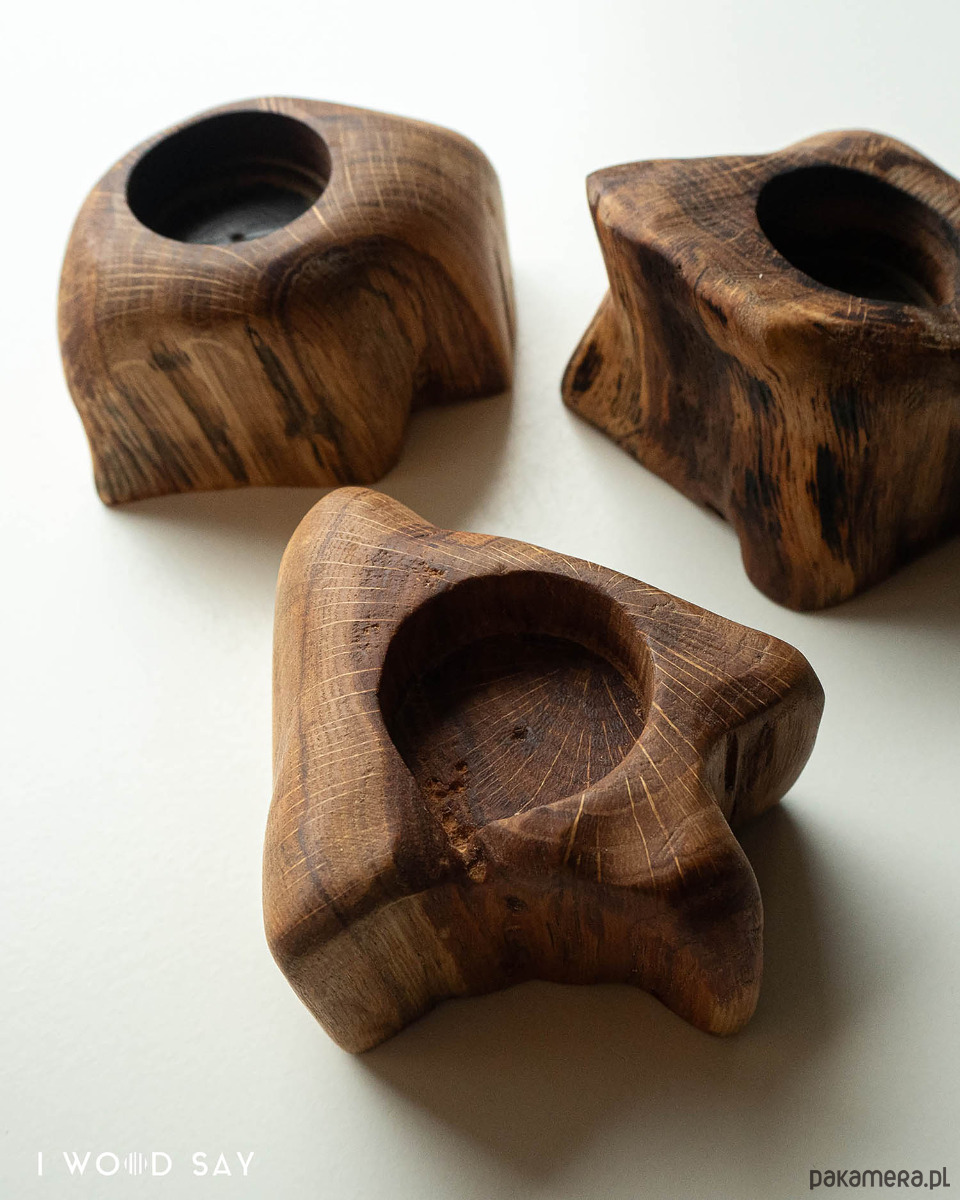 Zestaw trzech świeczników wykonanych z litego drewna dębowego, zachowujących naturalny kształt i rysunek słojów.