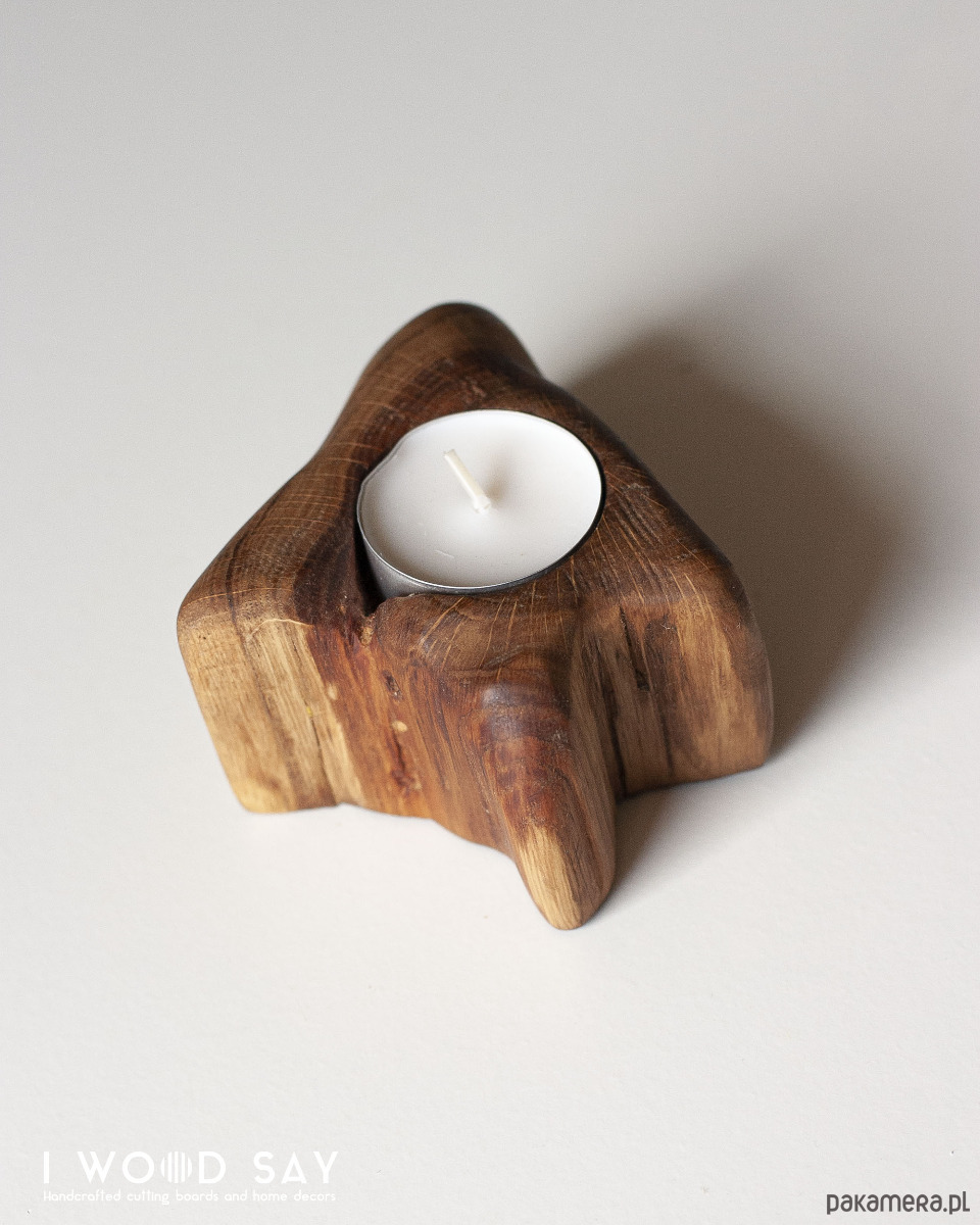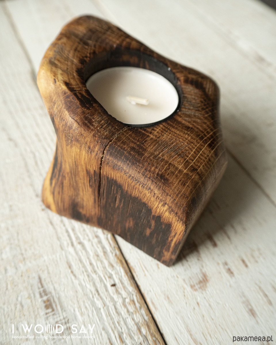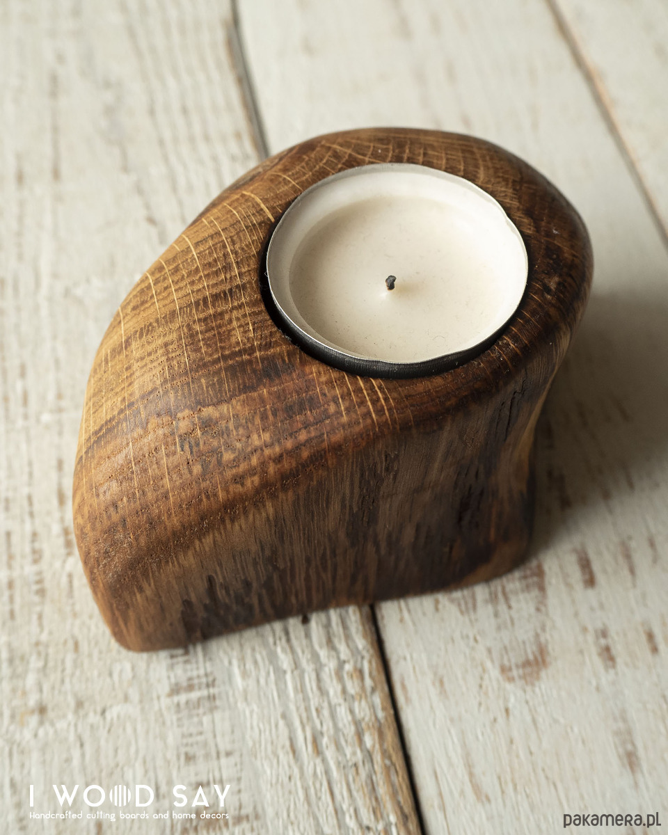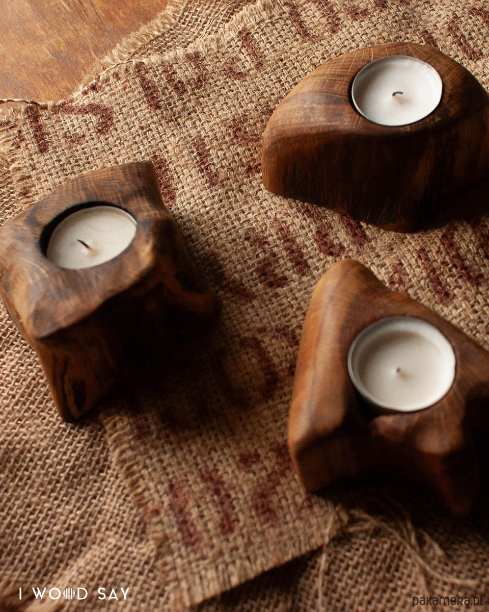 Zestaw trzech świeczników wykonanych z litego drewna dębowego, zachowujących naturalny kształt i rysunek słojów.