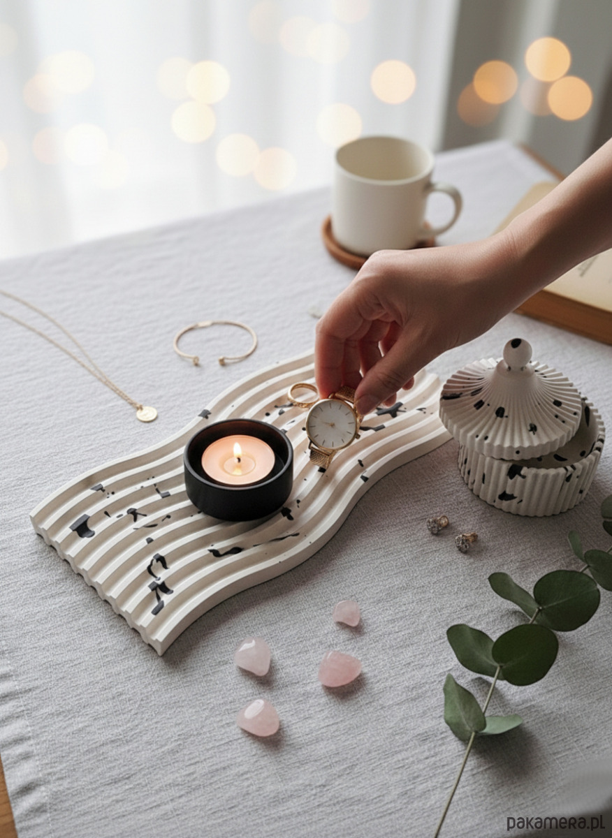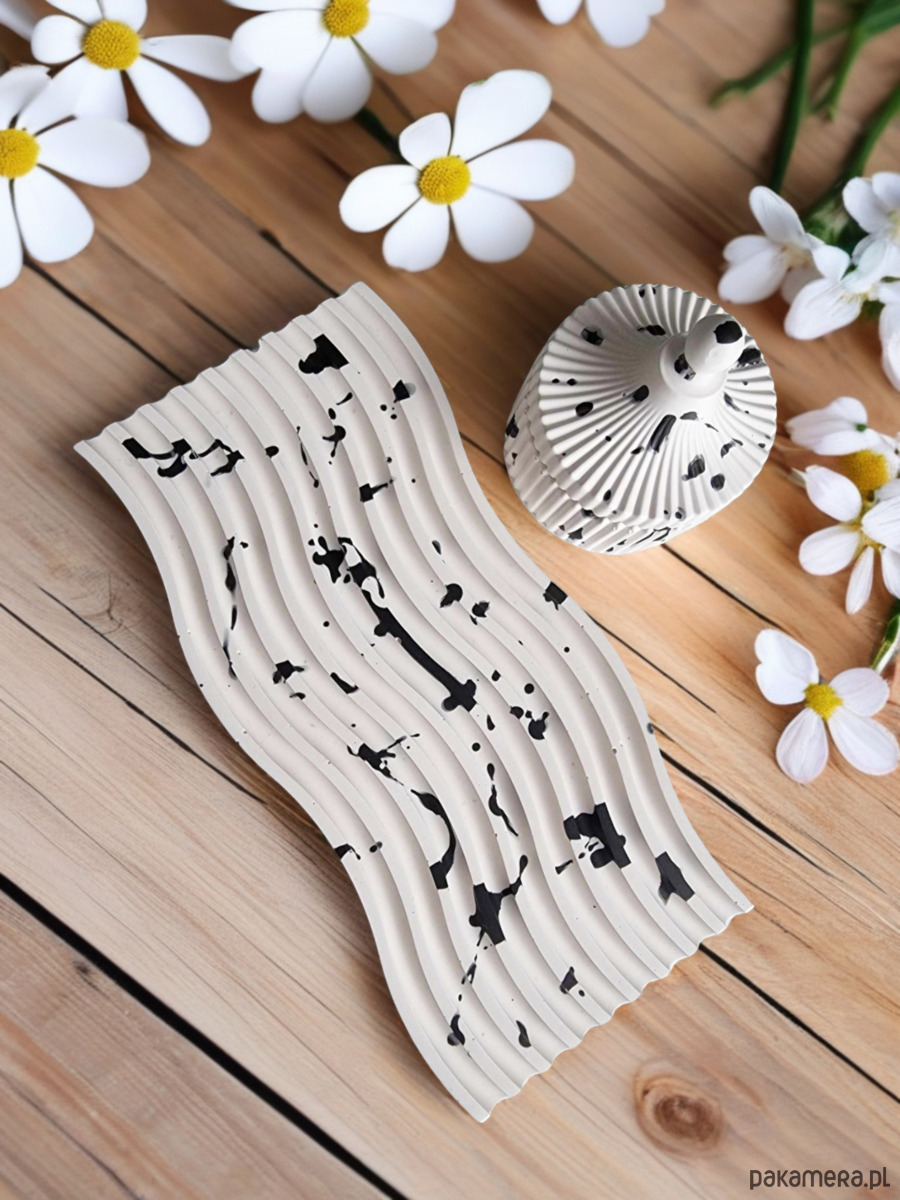 Odkryj wyjątkowy zestaw dekoracyjny, którym zachwycisz każdą kobietę! Składa się z dużej tacki i szkatułki wykonanych z wysokiej jakości gipsu polimerowego. Ich odcienie naturalne z czarnymi plamkami dodają elegancji i charakteru każdemu wnętrzu.