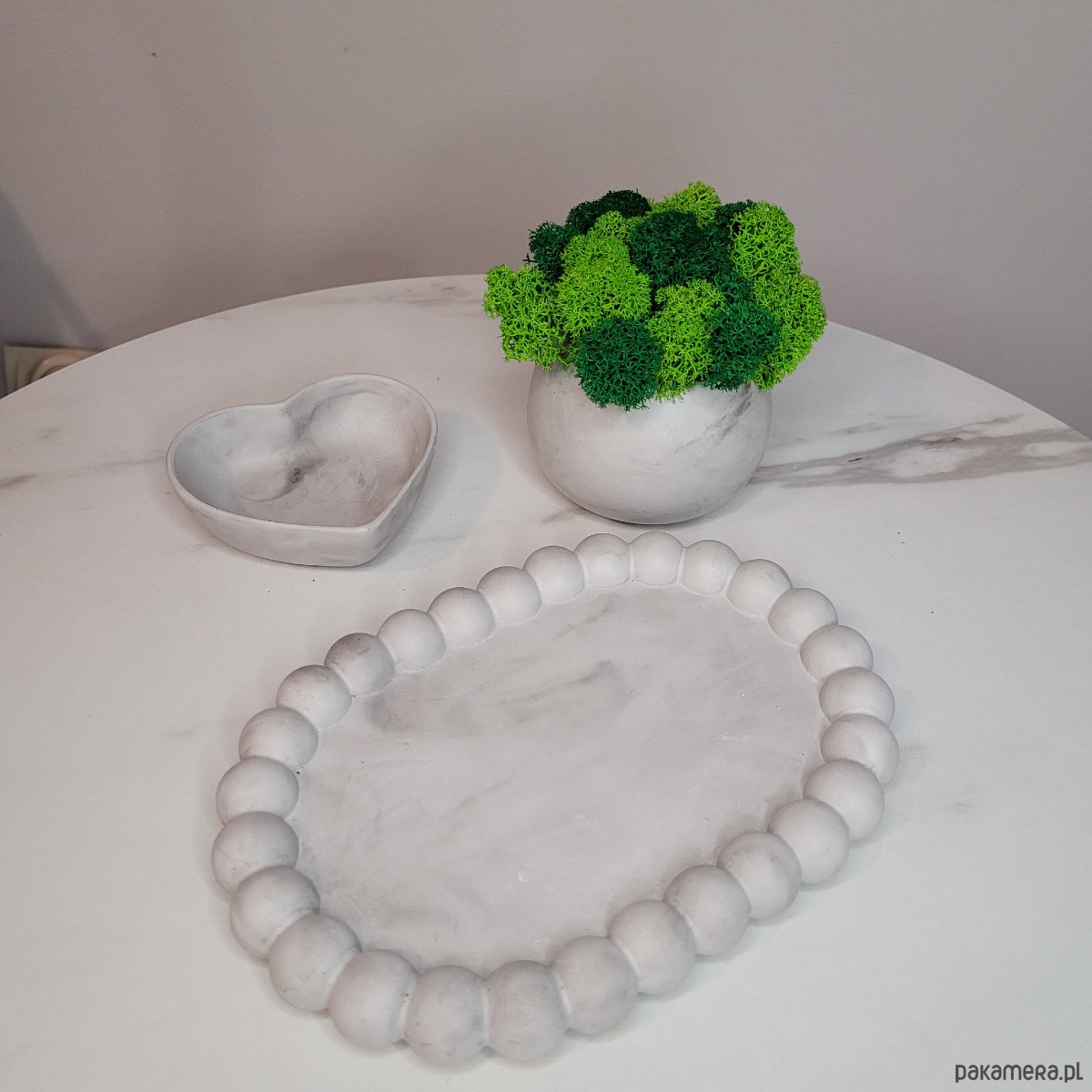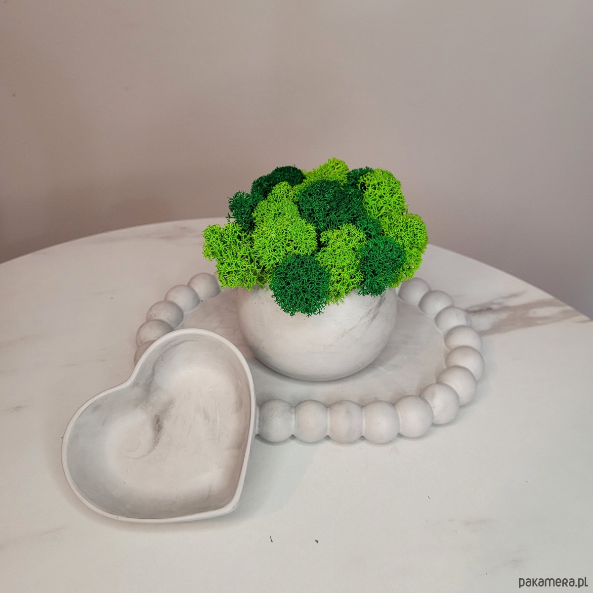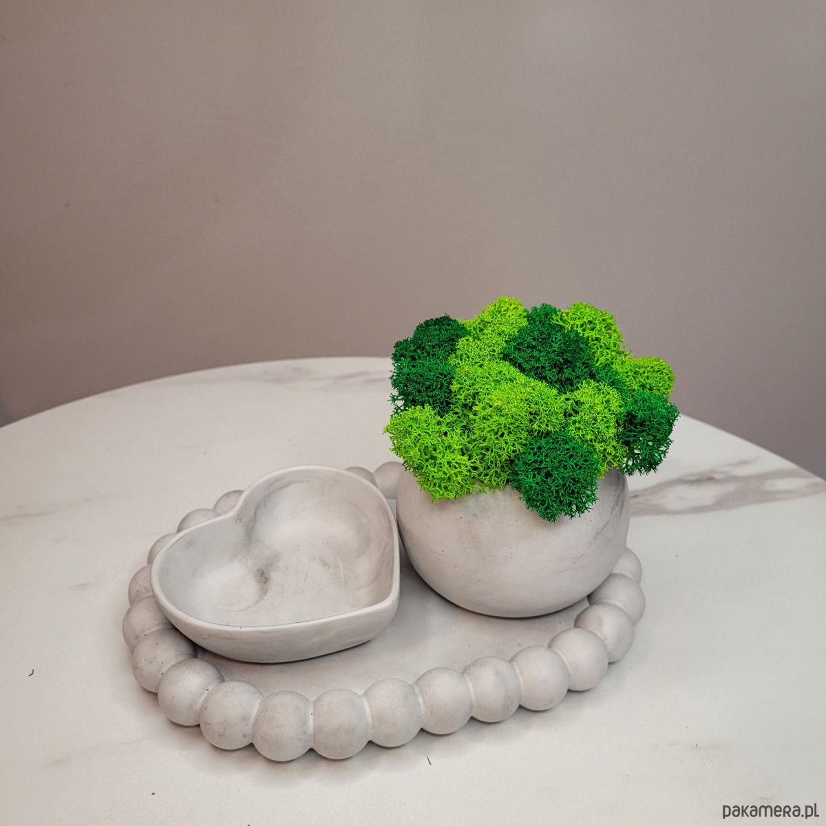 Stylowy zestaw w minimalistycznym stylu. Wykonanych w szarym kolorze doniczka z zielonym stabilizowanym mchem i szkatułka w formie serca.