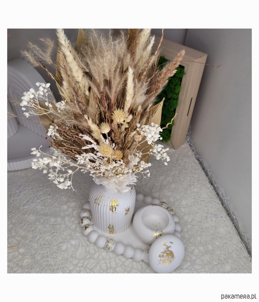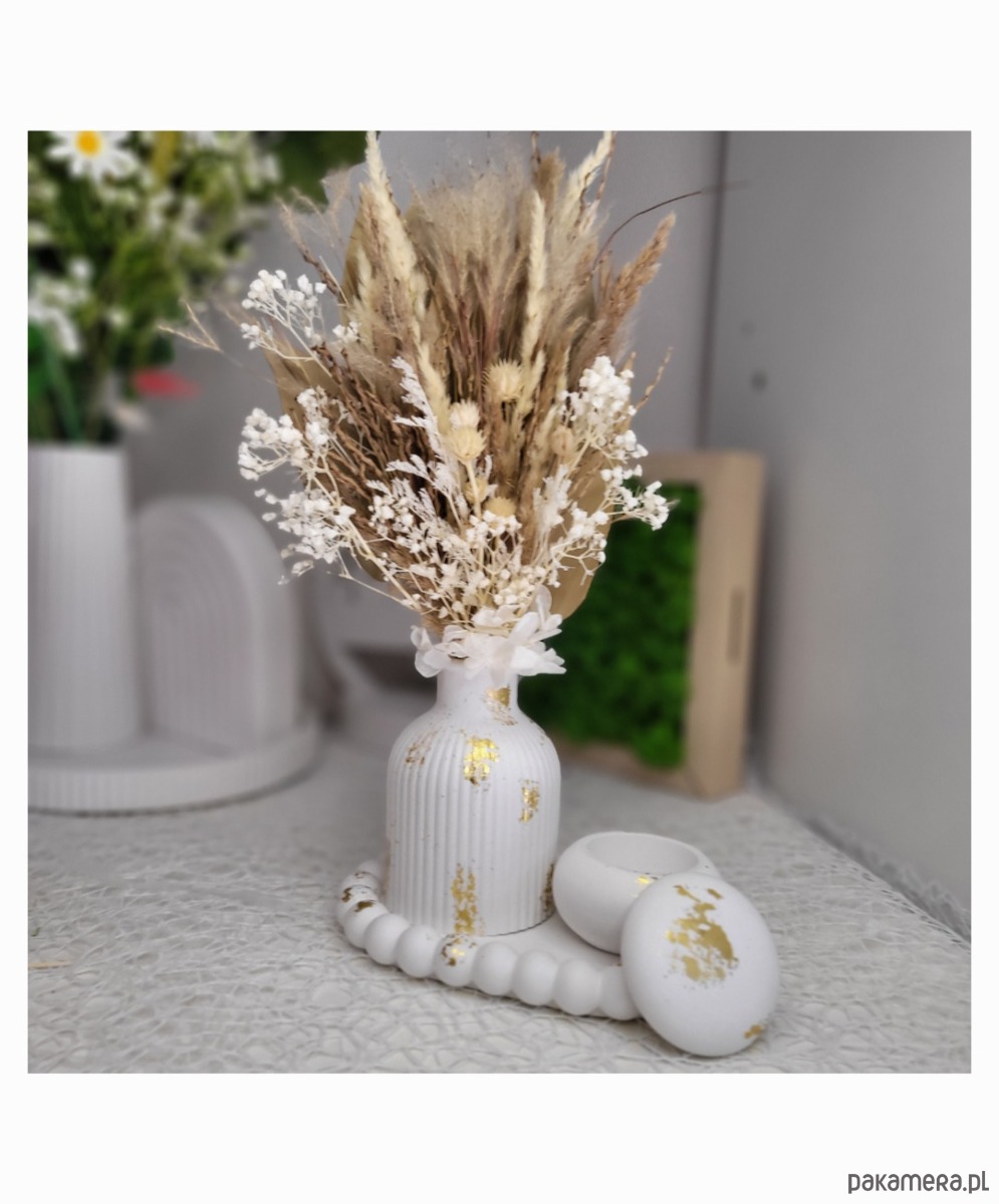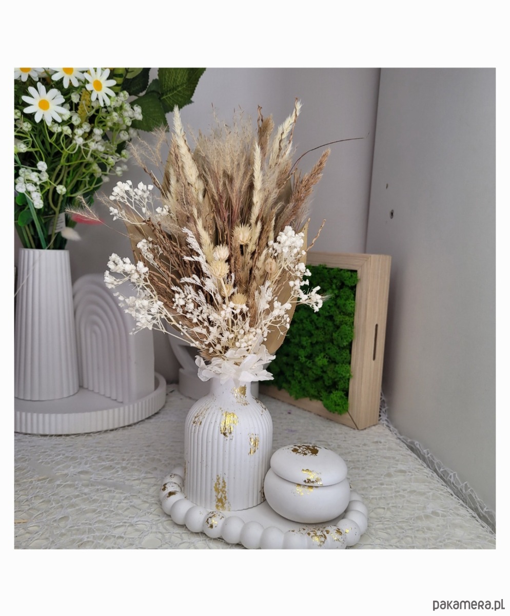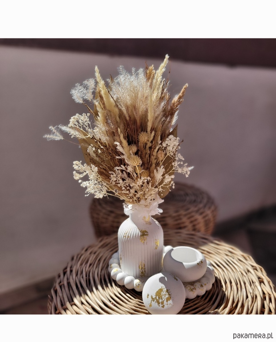 Oryginalny wazon z gipsu z eleganckimi suszonymi kwiatami, które dodadzą przytulności Twojemu wnętrzu.