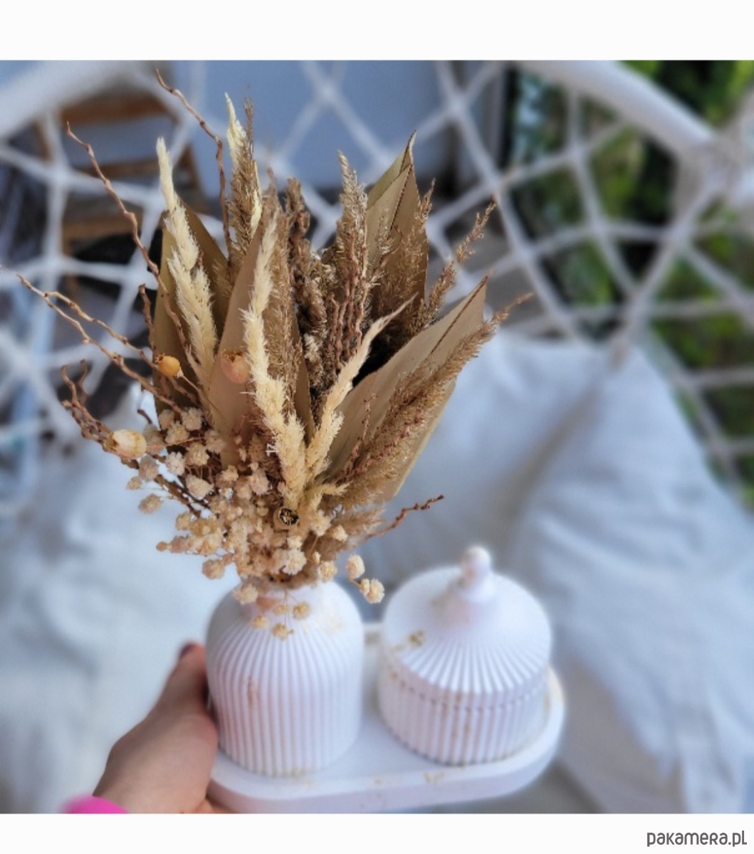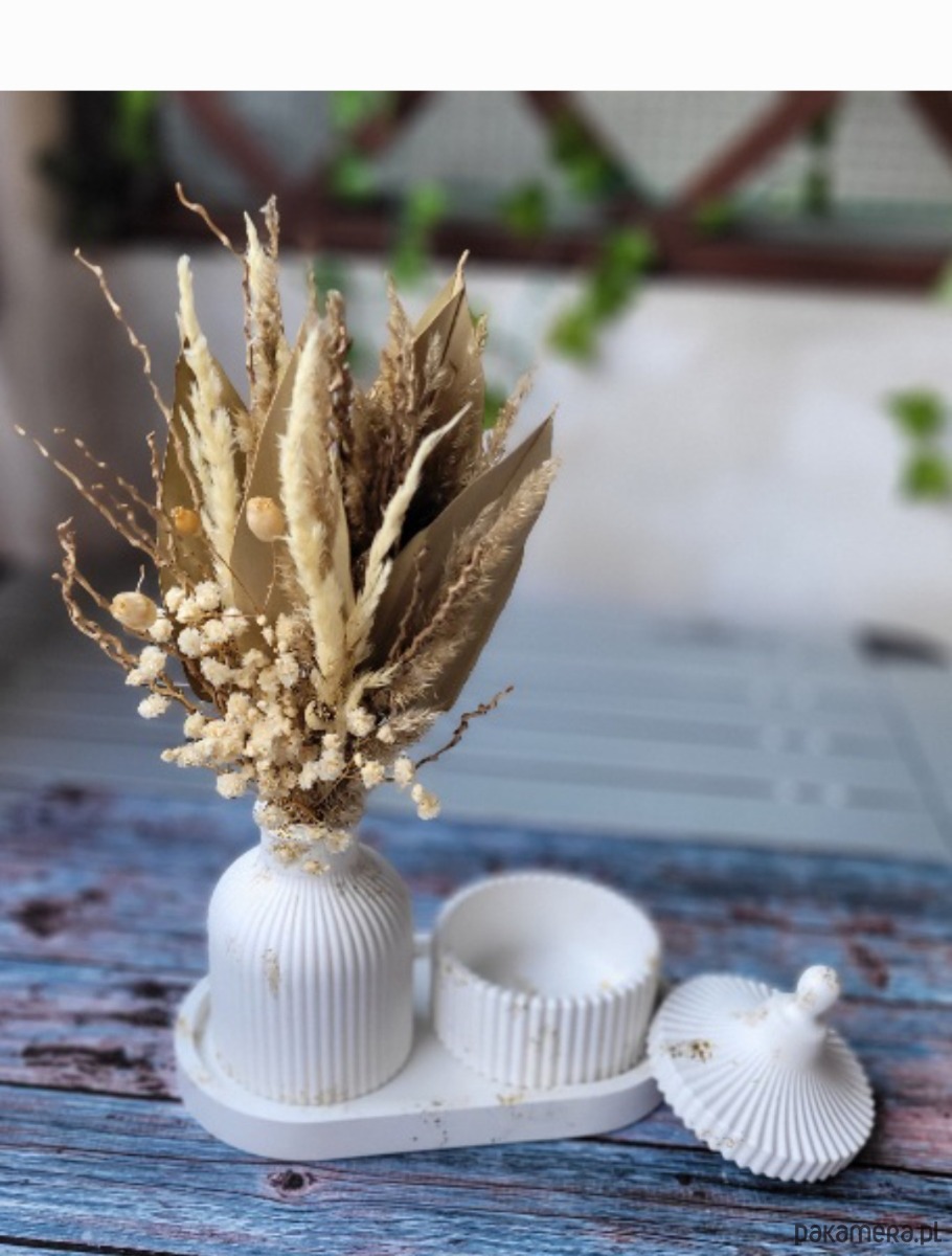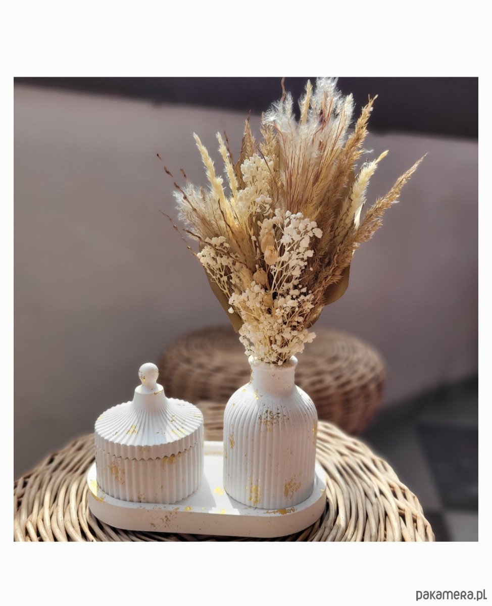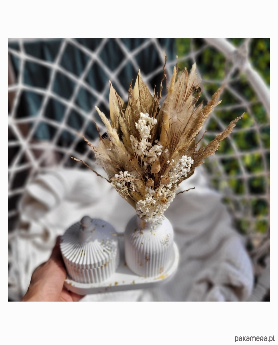 Oryginalny wazon z gipsu z eleganckimi suszonymi kwiatami, które dodadzą przytulności Twojemu wnętrzu.