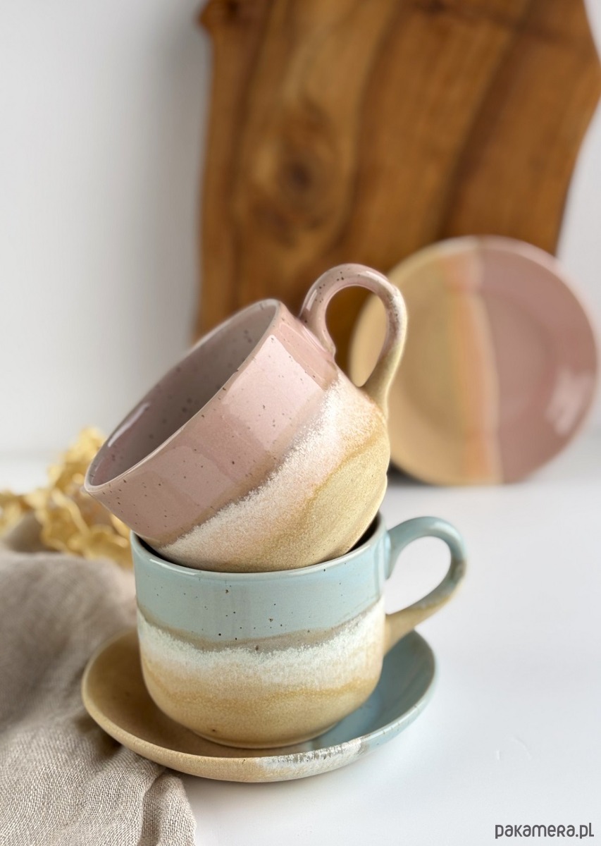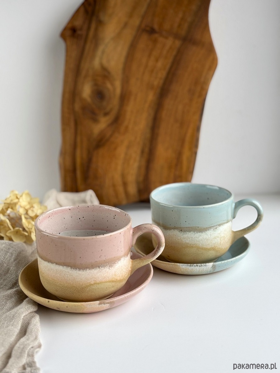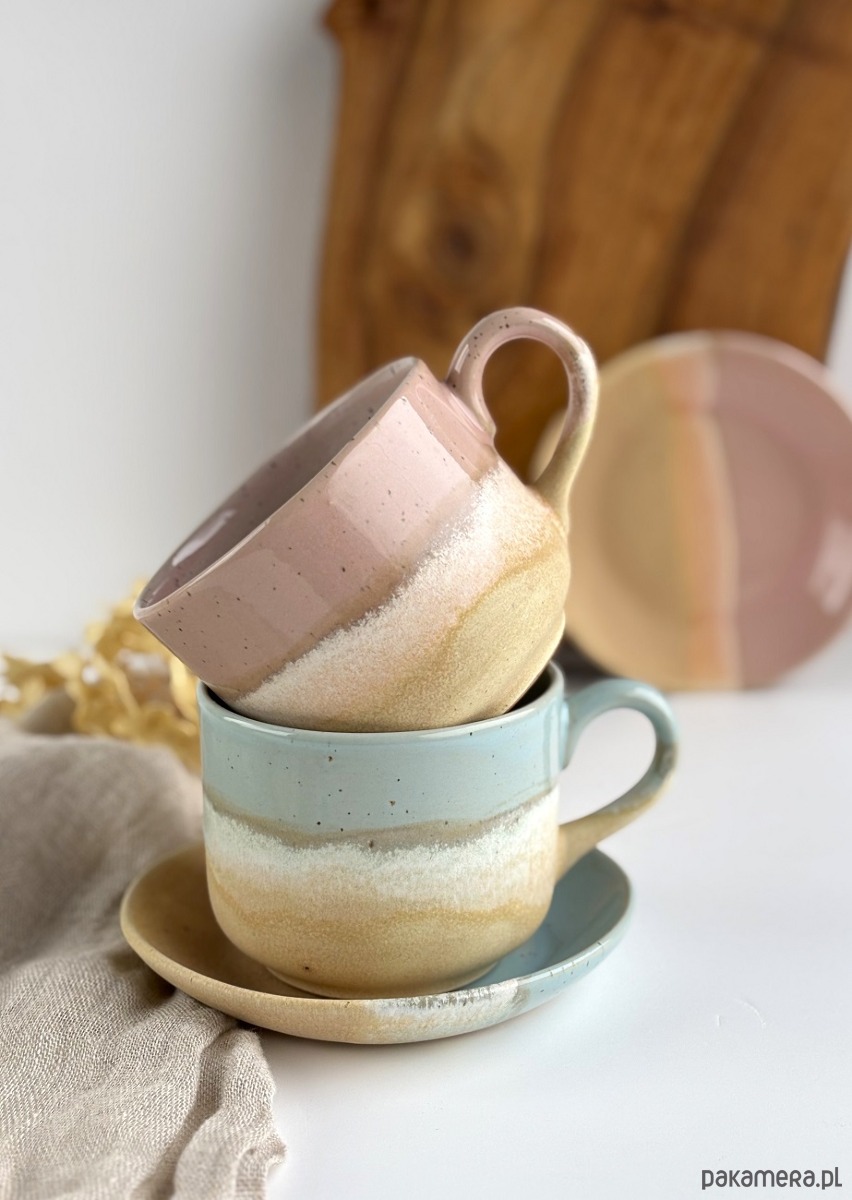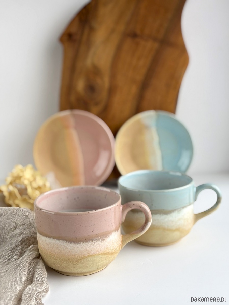 Filiżanki pokryte są szkliwami spożywczymi w odcieniach: różu / niebieskiego oraz odcieni piasku na beżowej masie ceramicznej z drobinkami bazaltu, które tworzą urocze, drobne piegi.