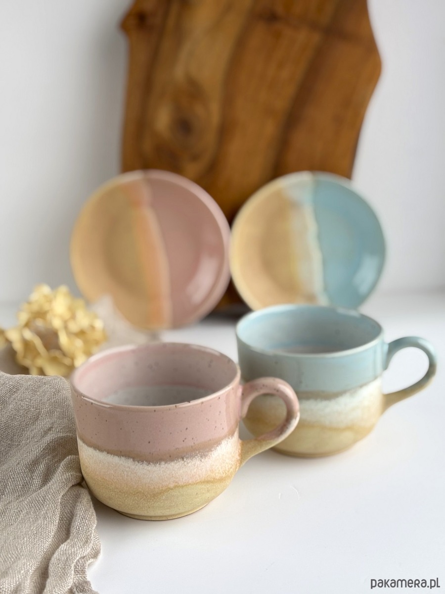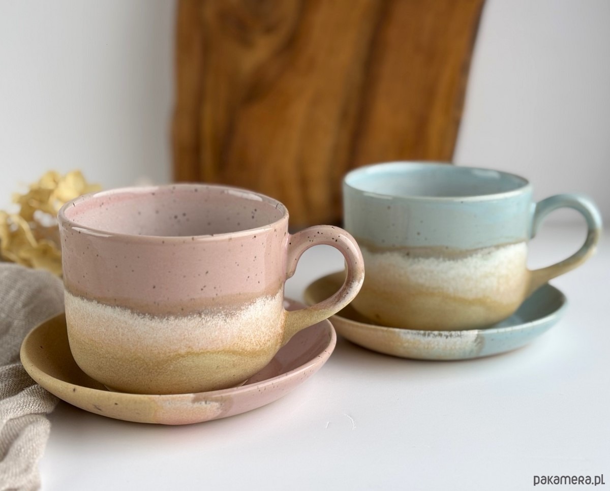 Filiżanki pokryte są szkliwami spożywczymi w odcieniach: różu / niebieskiego oraz odcieni piasku na beżowej masie ceramicznej z drobinkami bazaltu, które tworzą urocze, drobne piegi.