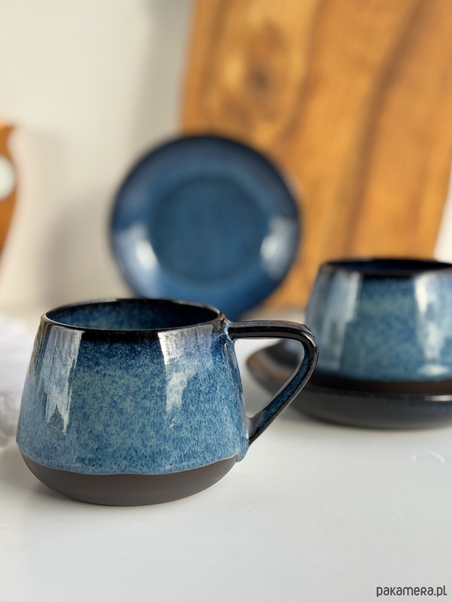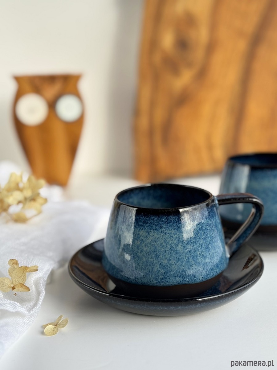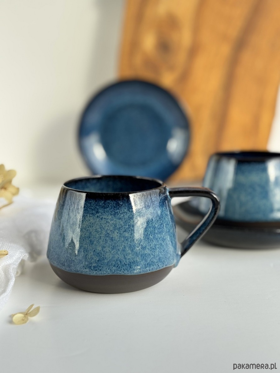 Filiżanka pokryta jest szkliwami spożywczymi w odcieniach: niebieskiego, granatu oraz czerni na obrzeżach.
