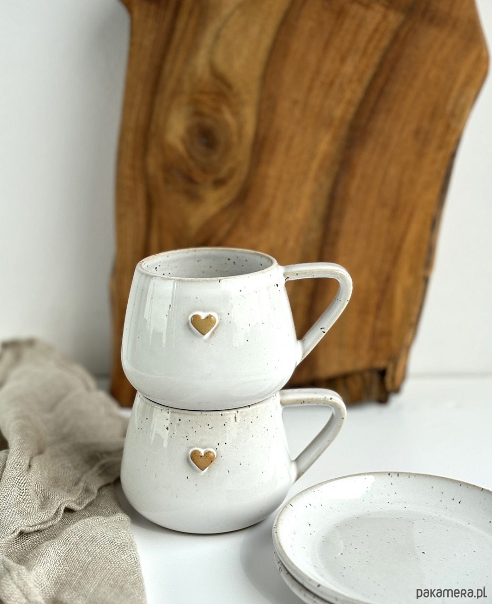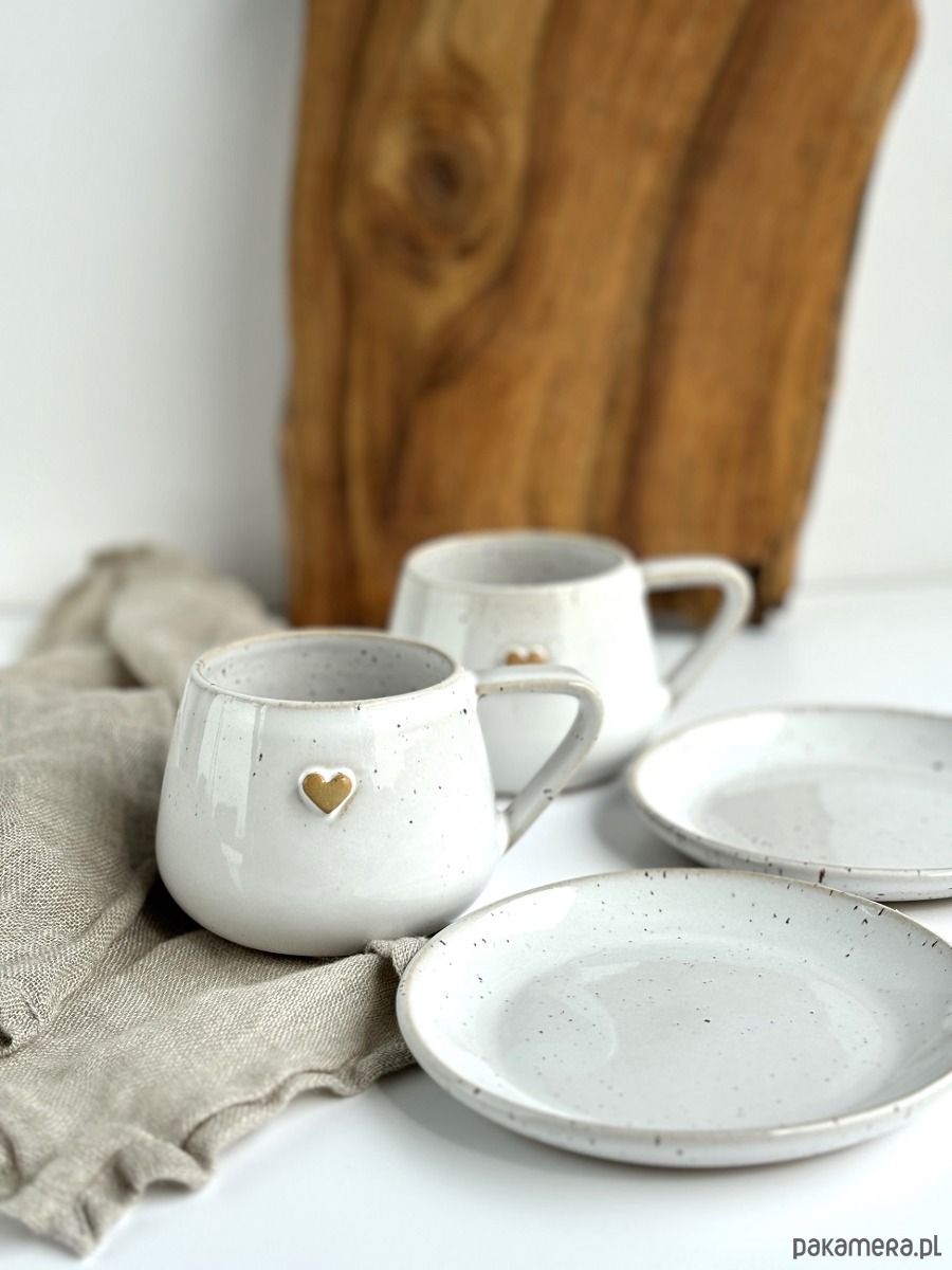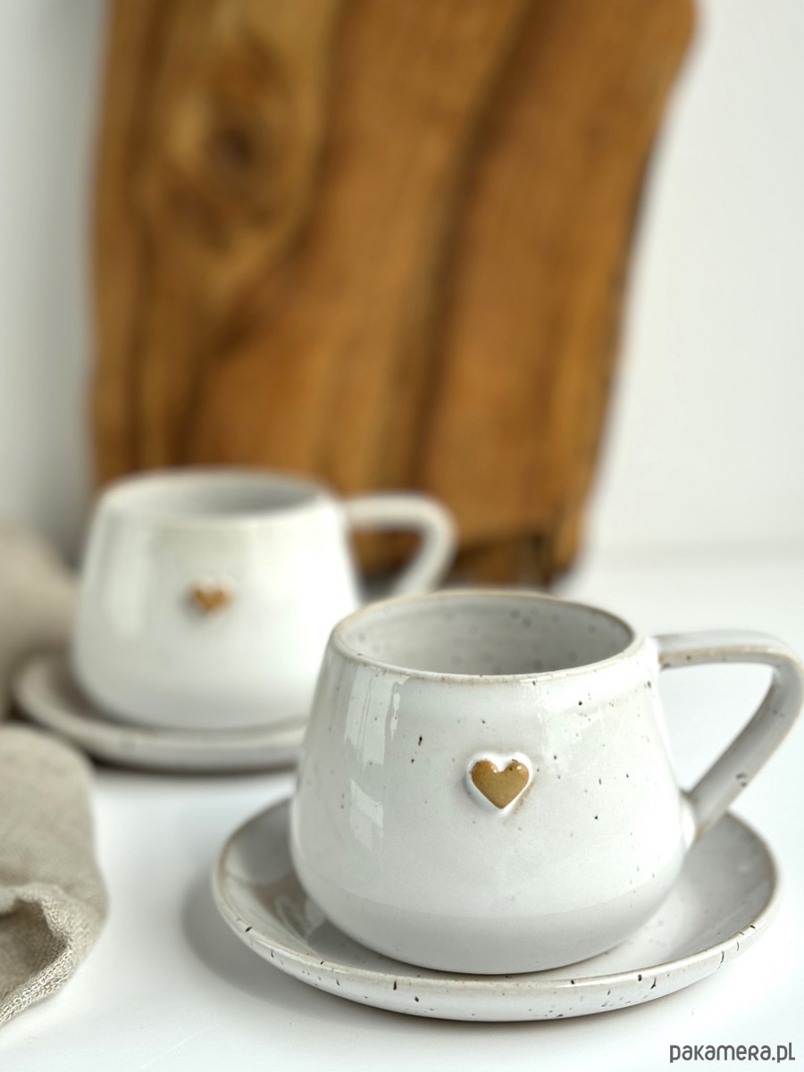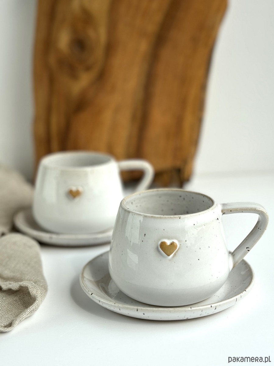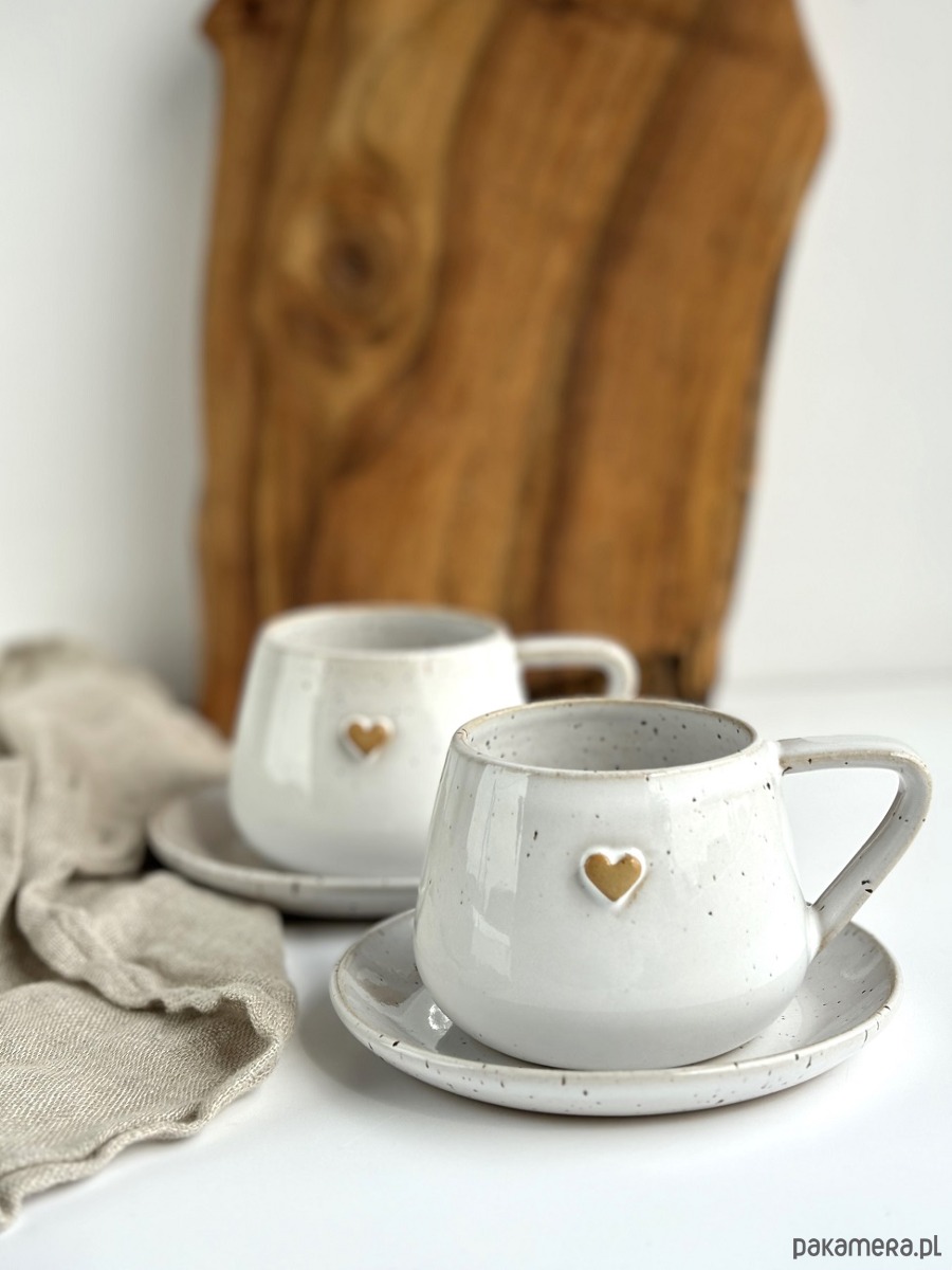 Zestaw dla dwojga - 2 x ręcznie robiona filiżanka ceramiczna ze spodkiem beczułka 250 ml biała z sercem