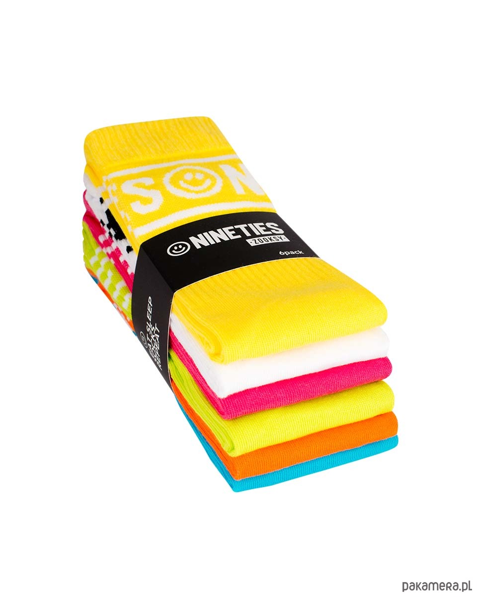 Zestaw skarpetek inspirowanych latami dziewięćdziesiątymi NINETIES to klasyczne skarpetki sportowe do połowy łydki dla wszystkich, którzy cenią wygodę i lubią nosić się w zgodzie ze współczesną modą. Idealnie sprawdzą się do sneakersów i jest to niezbędny dodatek do streetwearowych setów. 6 par skarpet