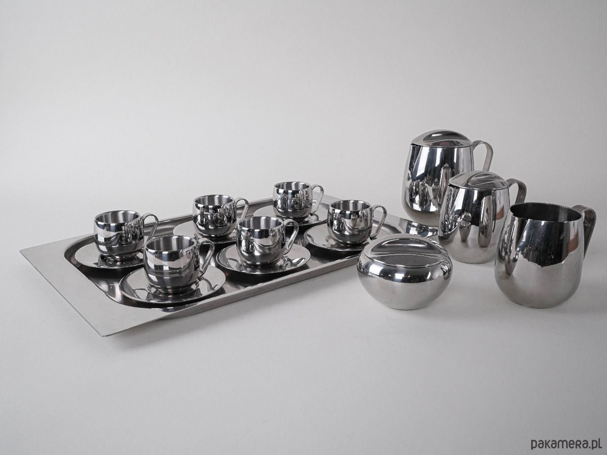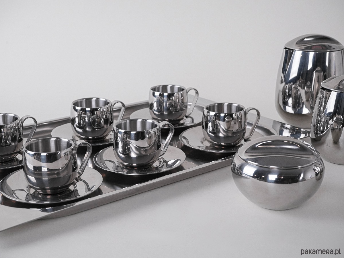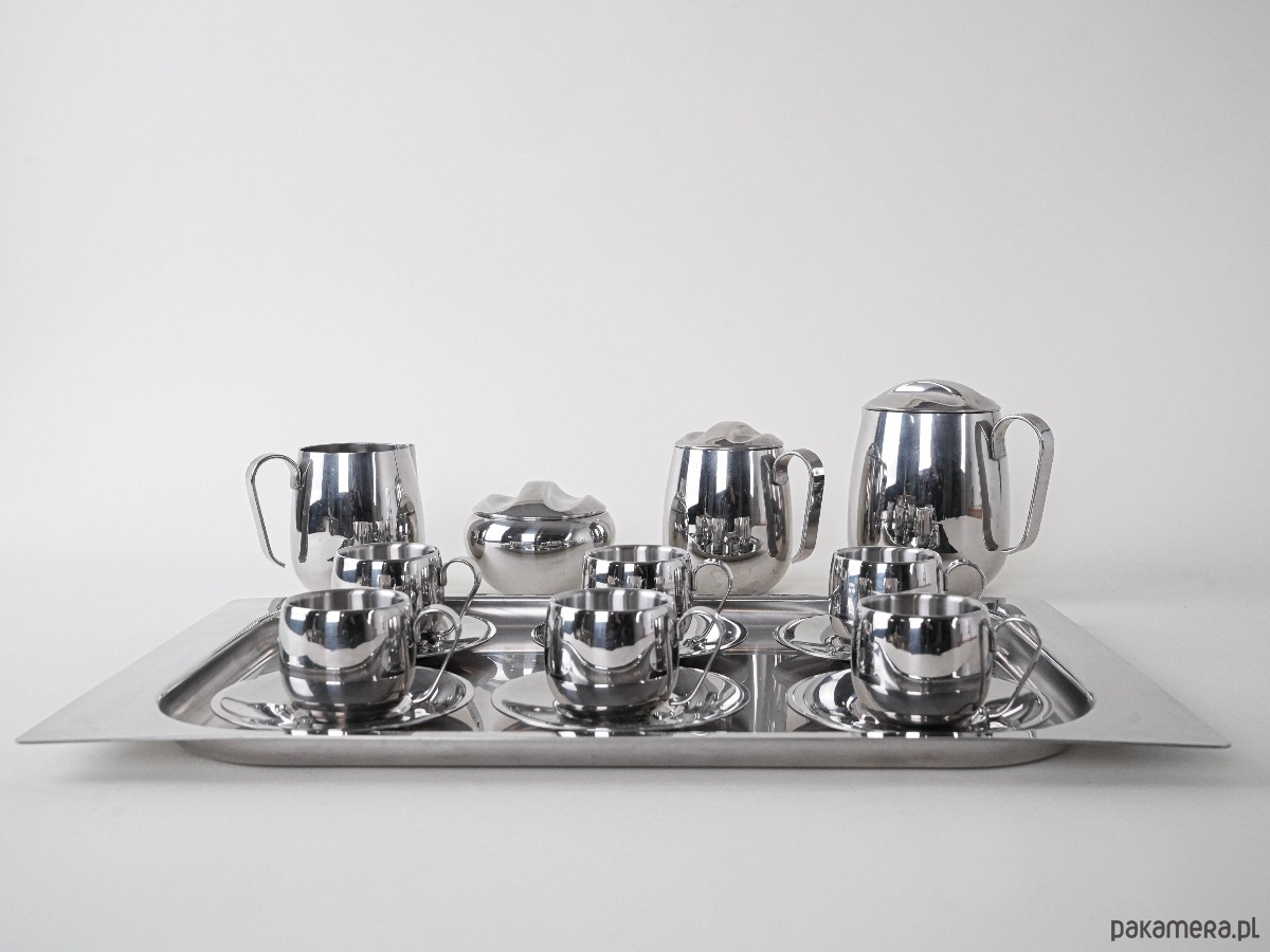 Zestaw do kawy i herbaty, utrzymany w duchu Mid Century Modern, wykonany z polerowanej stali nierdzewnej. Zestaw charakteryzuje się minimalistycznym, eleganckim designem, typowym dla wzornictwa lat 60./70. Całość składa się z dużej tacy o wymiarach 50x30 cm, cukiernicy 7,5x10 cm, mlecznika, dzbanka, pojemnika z pokrywką oraz 6 kubków. Proste, geometryczne formy w połączeniu z połyskującą powierzchnią metalu tworzą ponadczasowy komplet, który sprawdzi się zarówno w codziennym użytku, jak i jako stylowy element dekoracyjny.