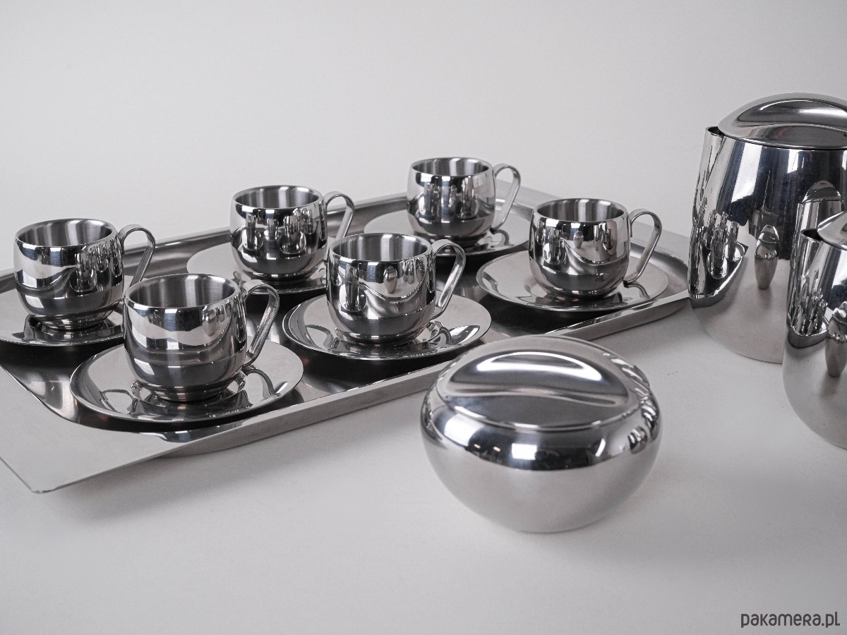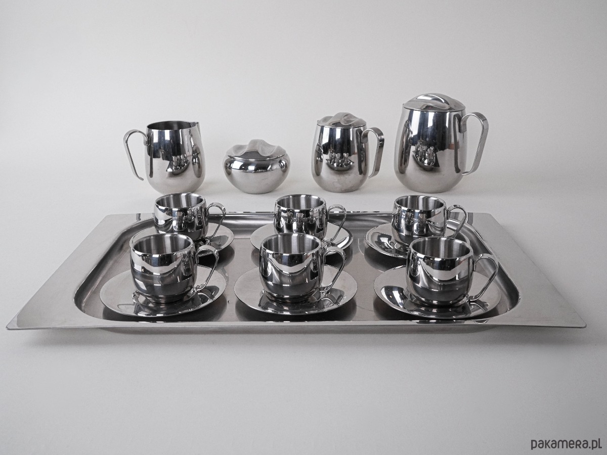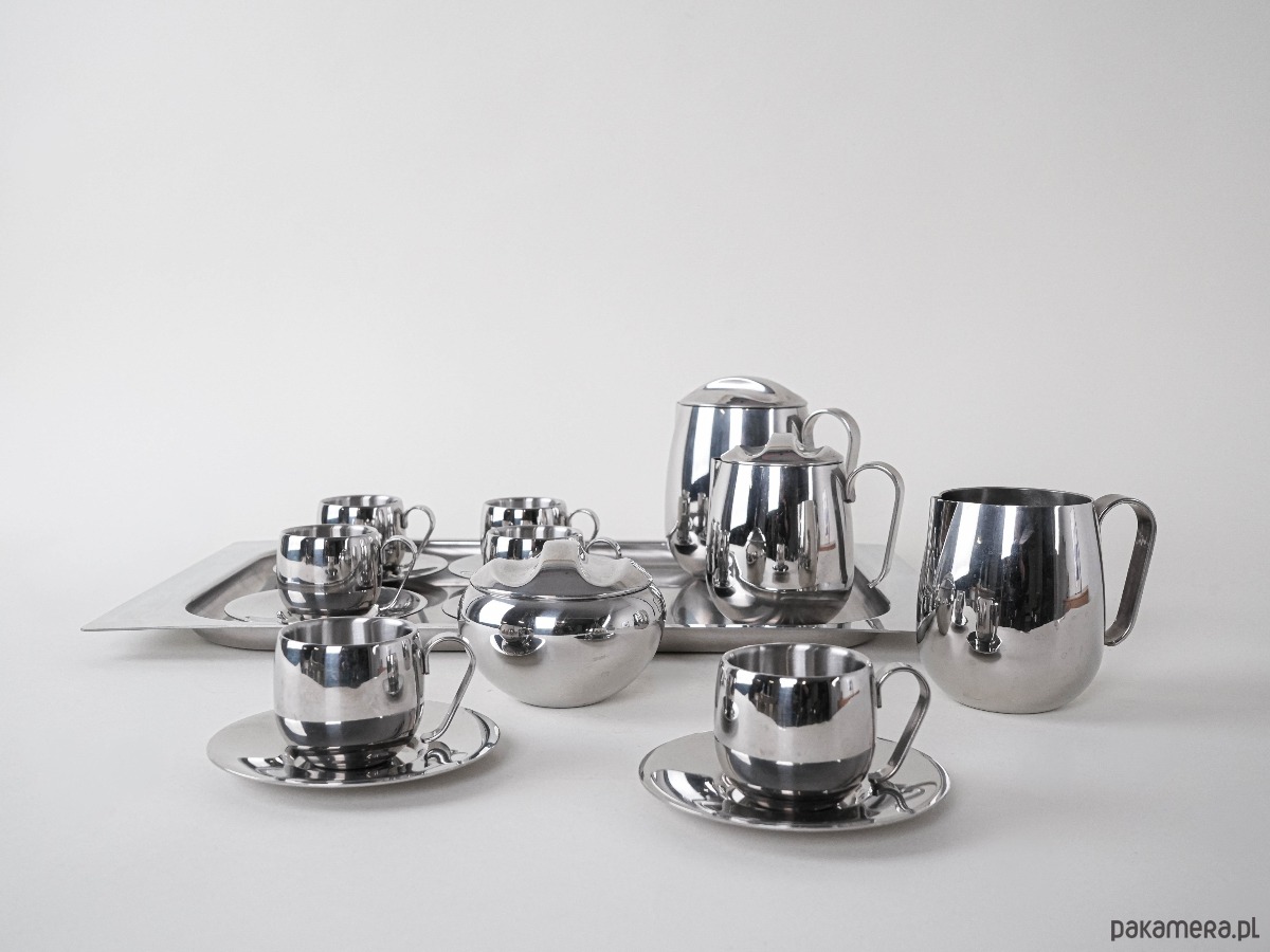 Zestaw do kawy i herbaty, utrzymany w duchu Mid Century Modern, wykonany z polerowanej stali nierdzewnej. Zestaw charakteryzuje się minimalistycznym, eleganckim designem, typowym dla wzornictwa lat 60./70. Całość składa się z dużej tacy o wymiarach 50x30 cm, cukiernicy 7,5x10 cm, mlecznika, dzbanka, pojemnika z pokrywką oraz 6 kubków. Proste, geometryczne formy w połączeniu z połyskującą powierzchnią metalu tworzą ponadczasowy komplet, który sprawdzi się zarówno w codziennym użytku, jak i jako stylowy element dekoracyjny.