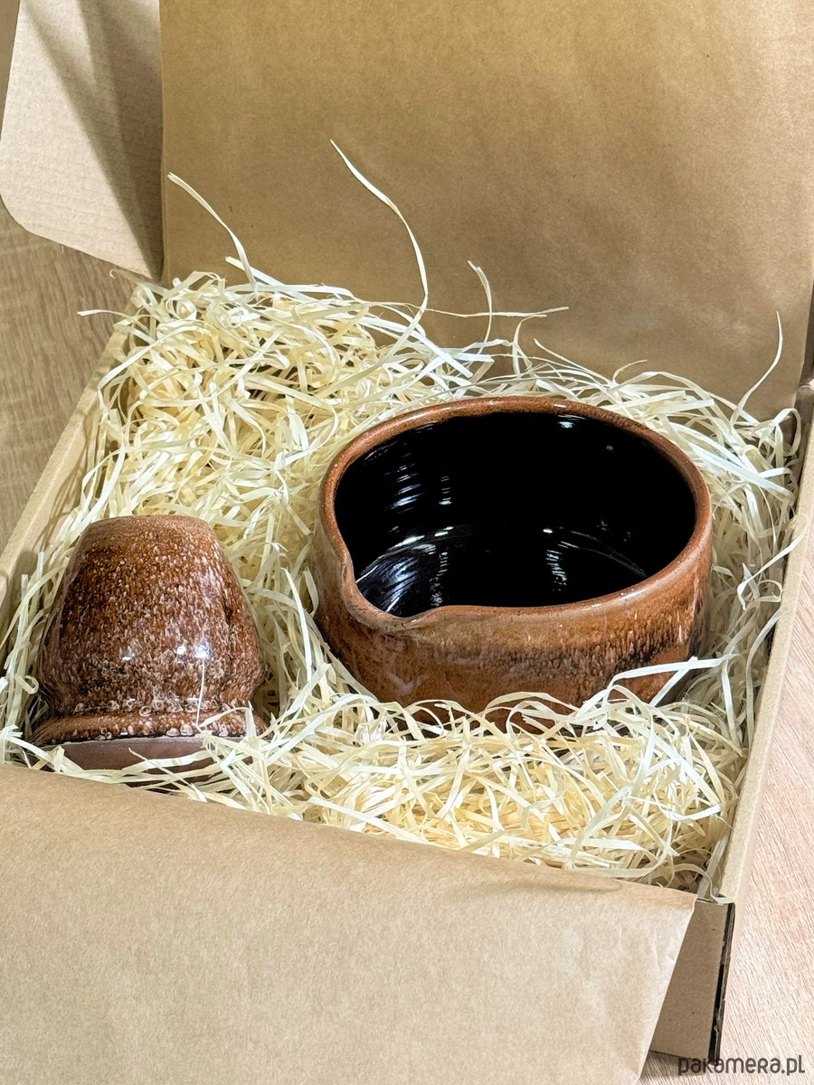Kolor: Czekoladowy Deszcz - głęboki czekoladowy brąz z czarnymi i beżowymi kroplami. Powierzchnia szkliwa ma błyszczące wykończenie. Spód tych naczyń jest odsłonięty i ukazuje naturalny kolor rudej gliny.