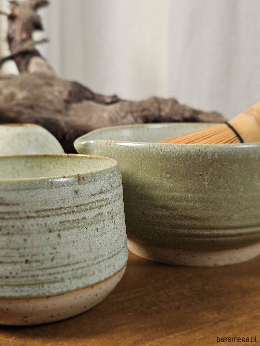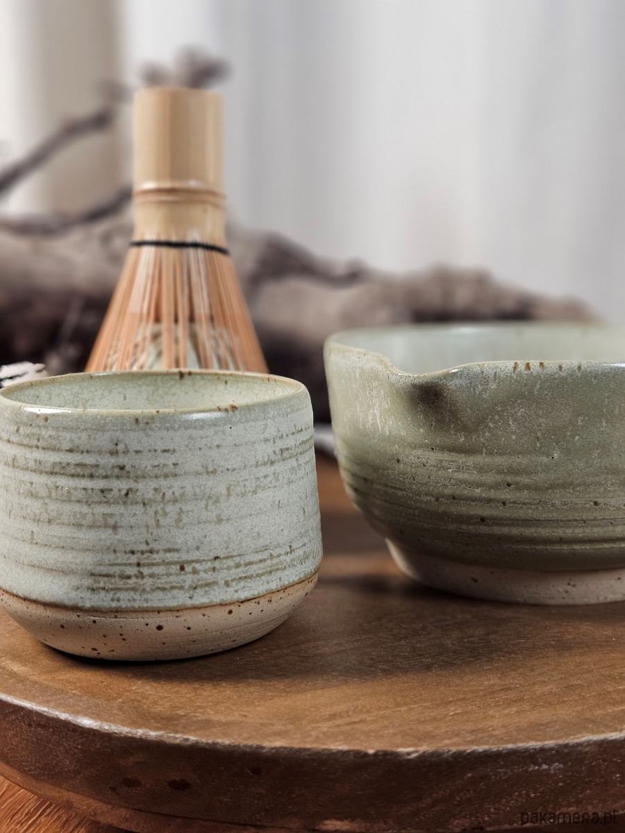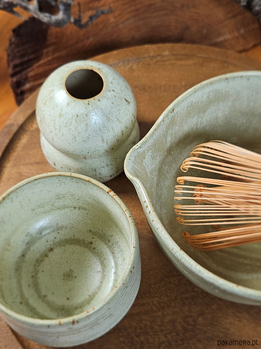 Zestaw do matchy składający się z miseczki do przygotowania napoju, czarki do picia oraz podstawki na miotełkę Chasen, umożliwiającej jej suszenie i bezpieczne przechowywanie.