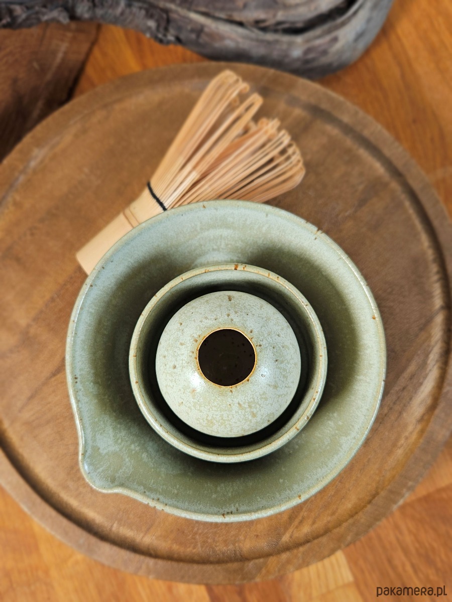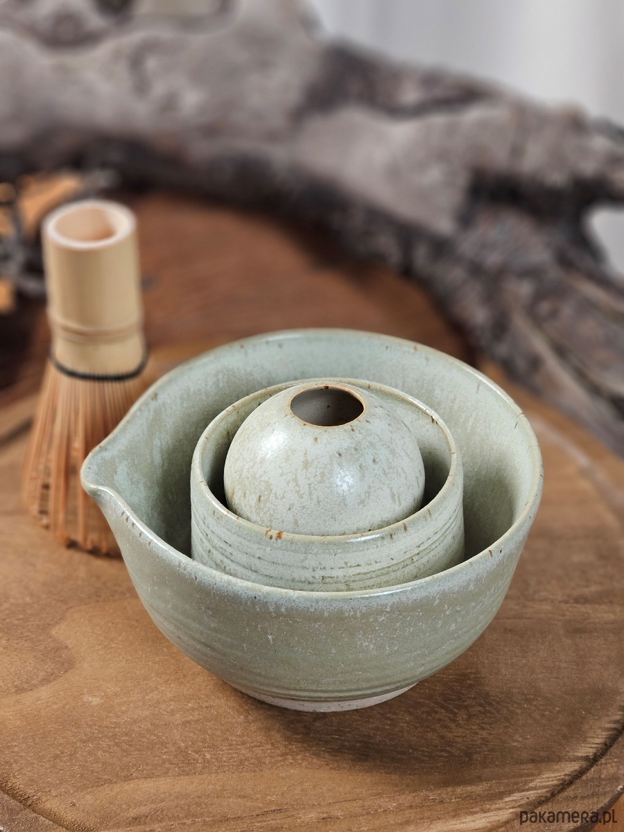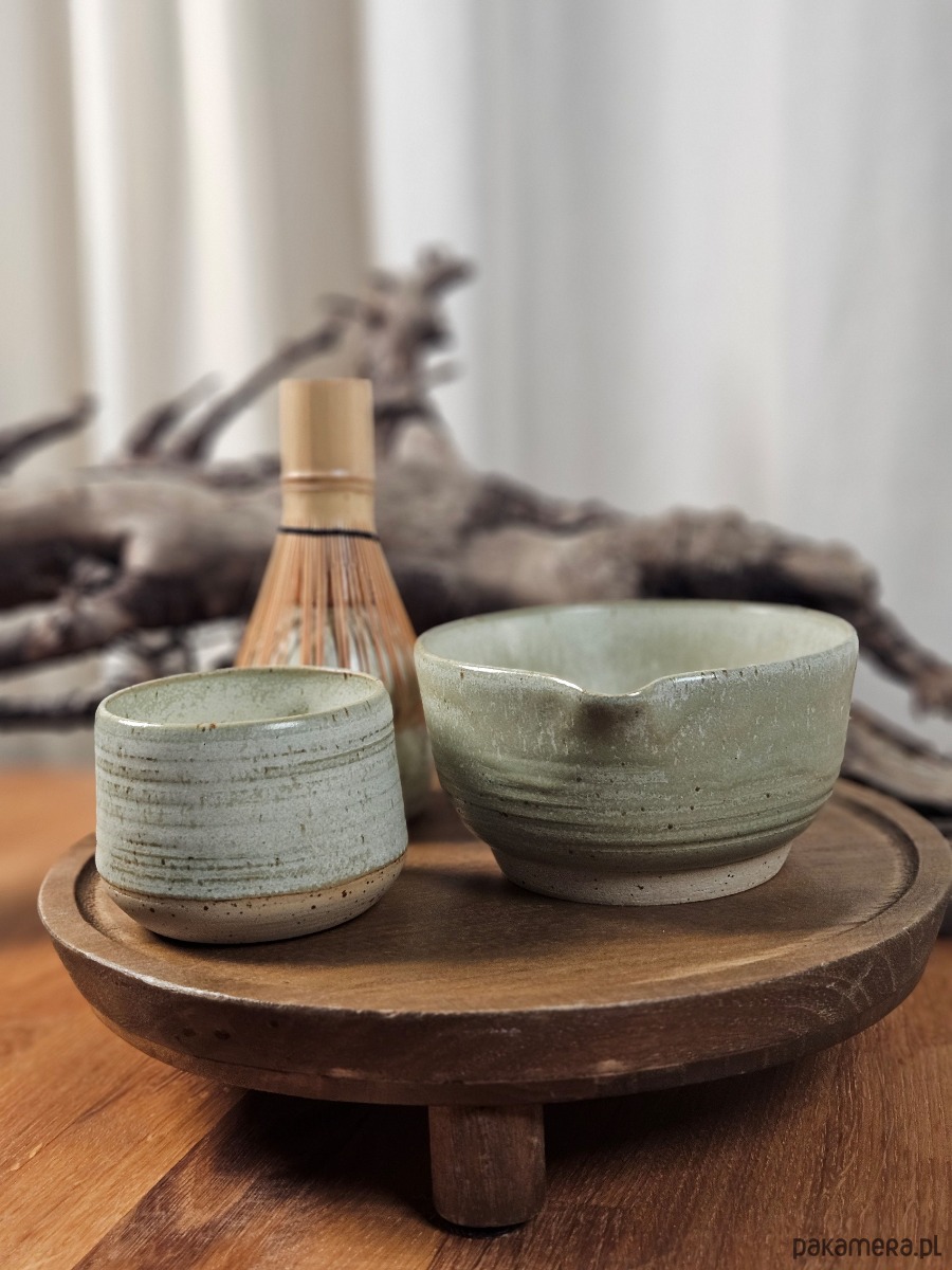 Zestaw do matchy składający się z miseczki do przygotowania napoju, czarki do picia oraz podstawki na miotełkę Chasen, umożliwiającej jej suszenie i bezpieczne przechowywanie.