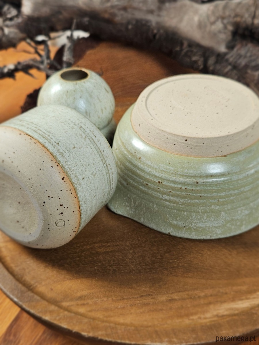 Zestaw wykonany jest z jasnej kamionki z ciemnymi drobinkami szamotu i pokryty szkliwem w odcieniu rozbielonej szałwi, z drobnymi beżowymi i rdzawymi plamkami. Szkliwo jest satynowe i daje neutralny, bardzo subtelny efekt.