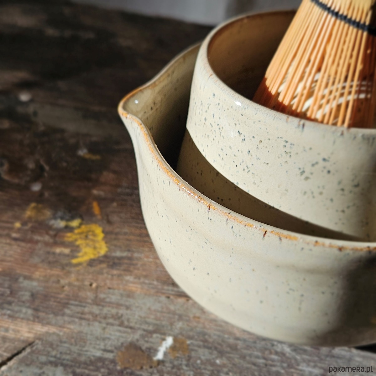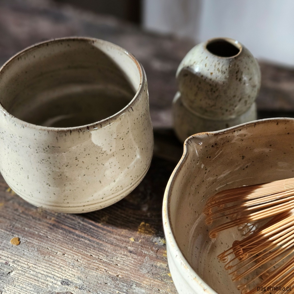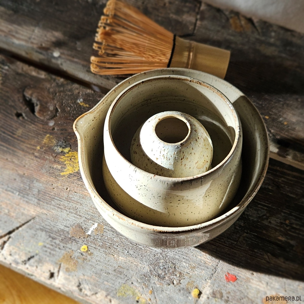 Zestaw do matchy składający się z miseczki do przygotowania napoju, czarki do picia oraz podstawki na miotełkę Chasen, umożliwiającej jej suszenie i bezpieczne przechowywanie.