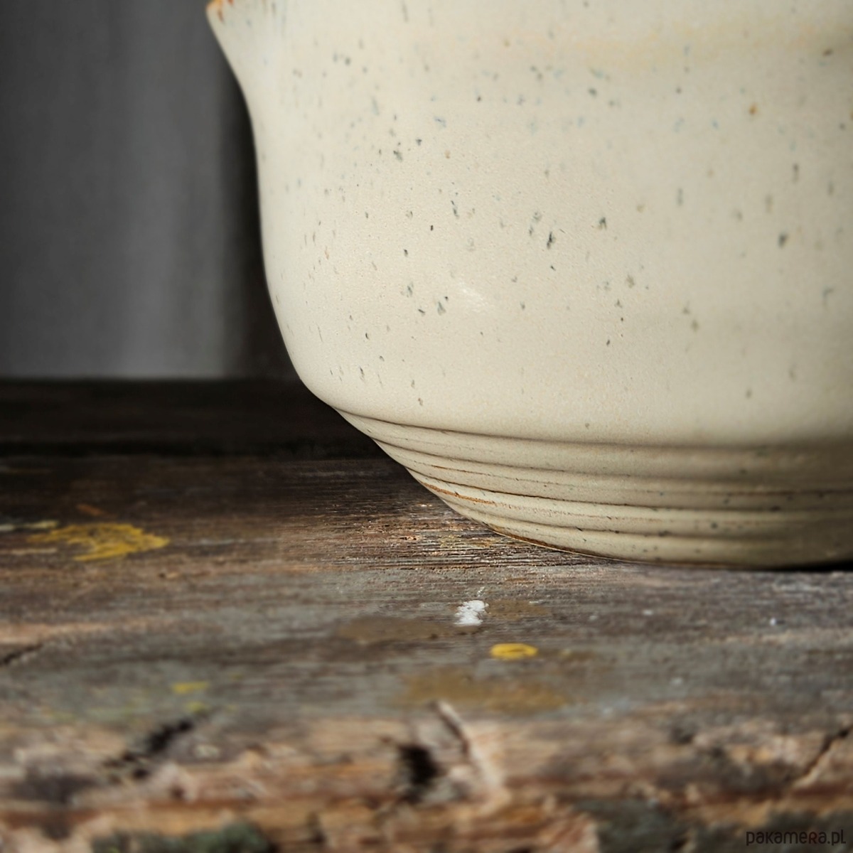 Zestaw MOJAVE wykonany jest z jasnej kamionki z ciemnymi drobinkami szamotu i pokryty nakrapianym szkliwem w odcieniach ciepłego beżu. Na krawędziach naczyń szkliwo przybiera brązowo - rudy odcień, co nadaje zestawowi lekko vintagowy charakter.