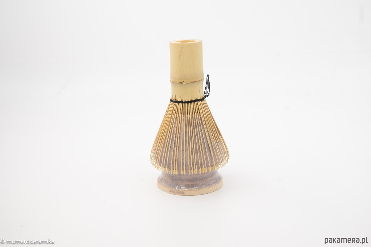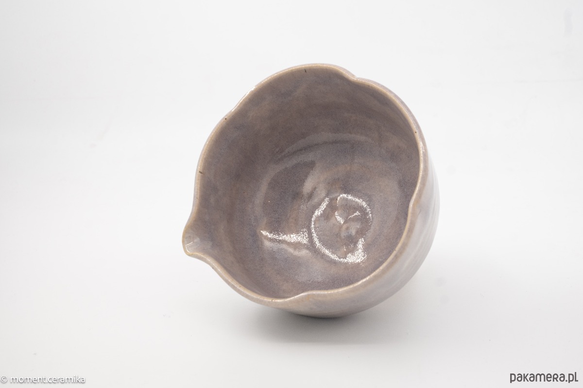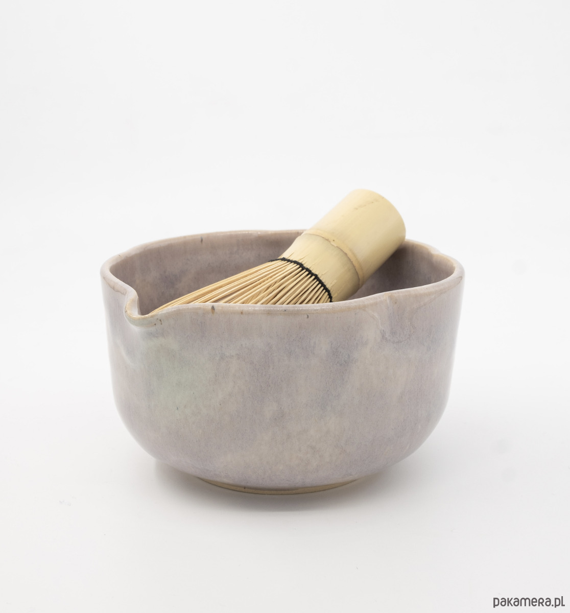 Zestaw do przygotowywania matchy, wykonany ręcznie na kole garncarskim, w kolorze liliowym. W zależności od światła może mieć kolor chłodnego różu, lub jasnego fioletu.