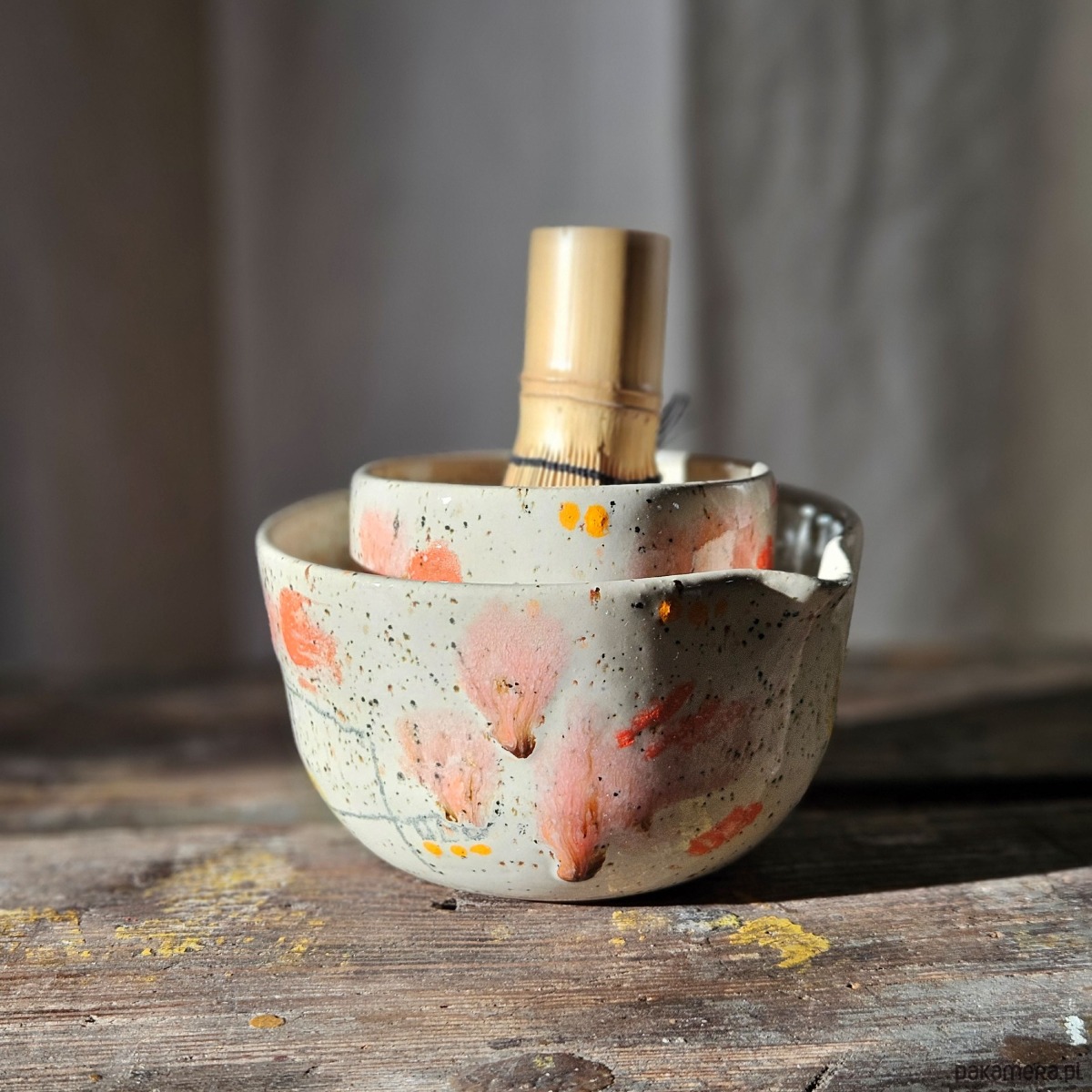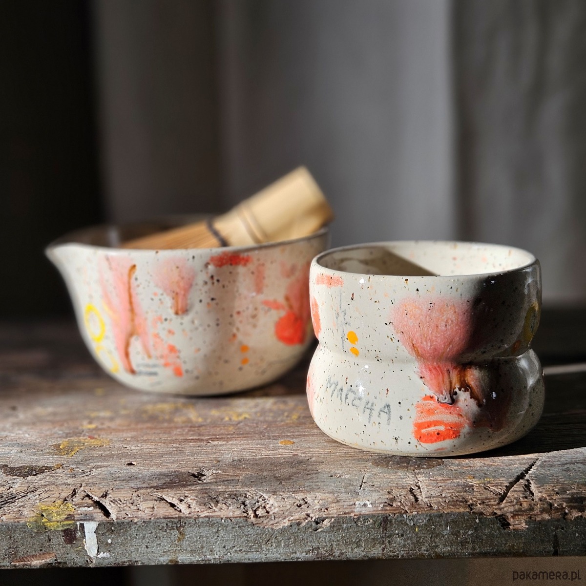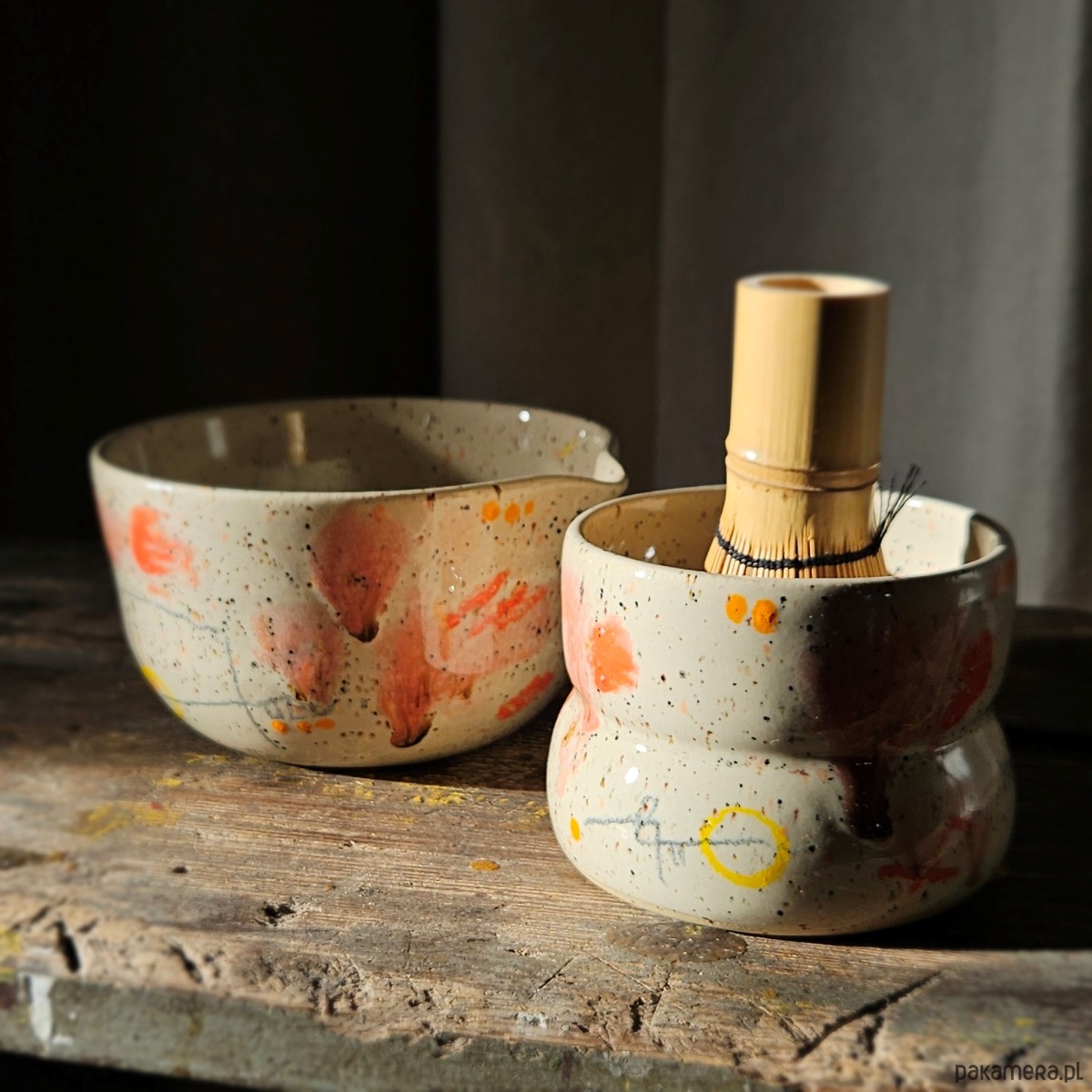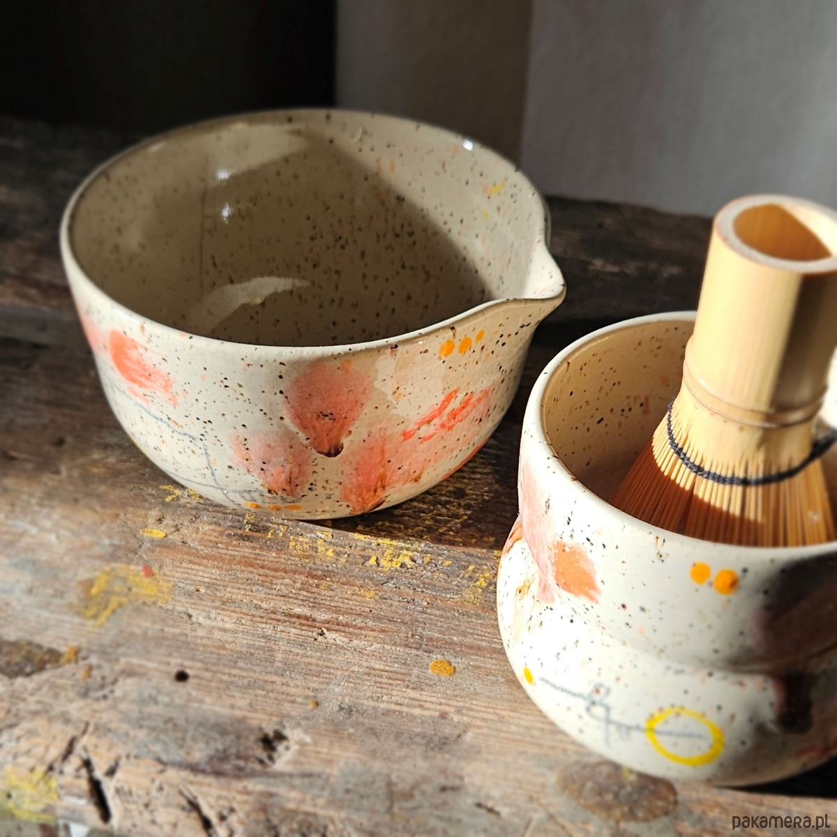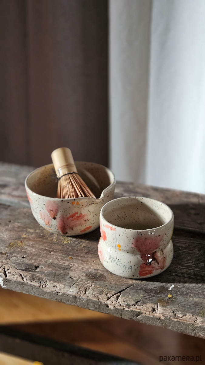 Zestaw do matchy składający się z miseczki do przygotowania napoju, czarki do picia oraz bambusowej miotełki Chasen.