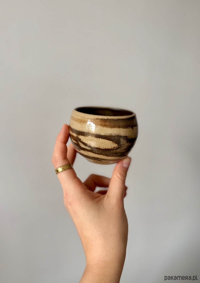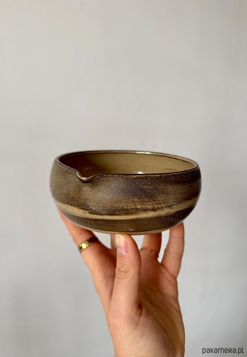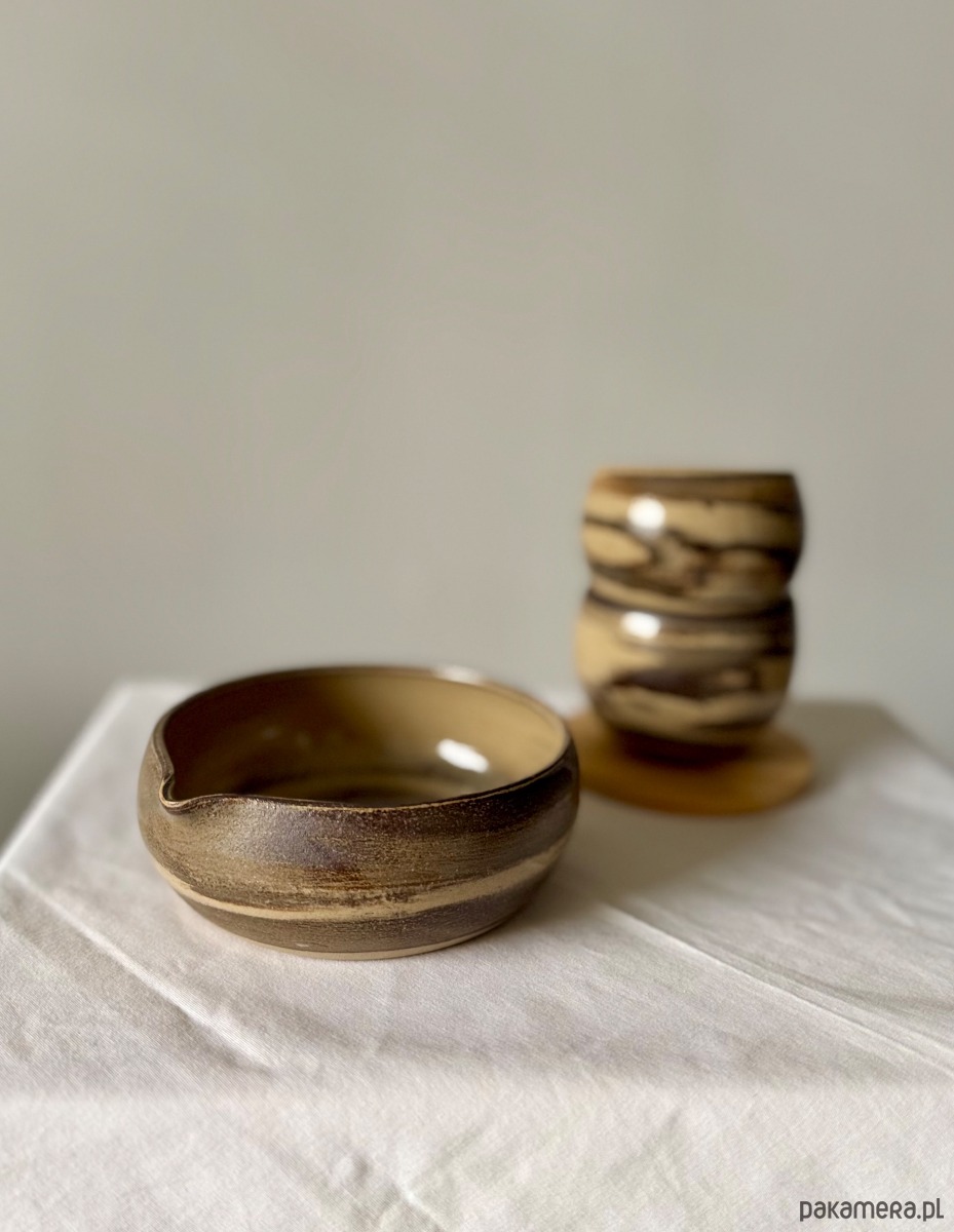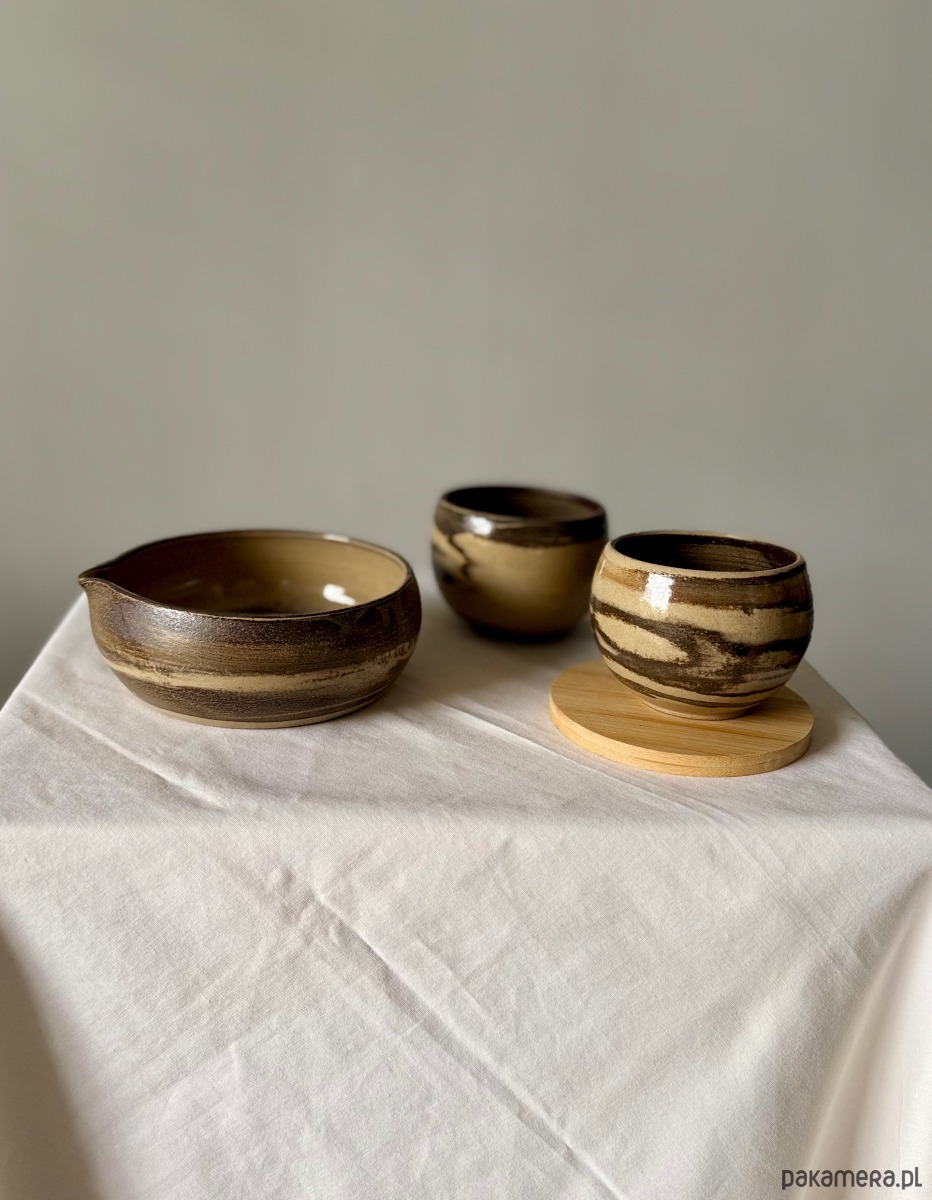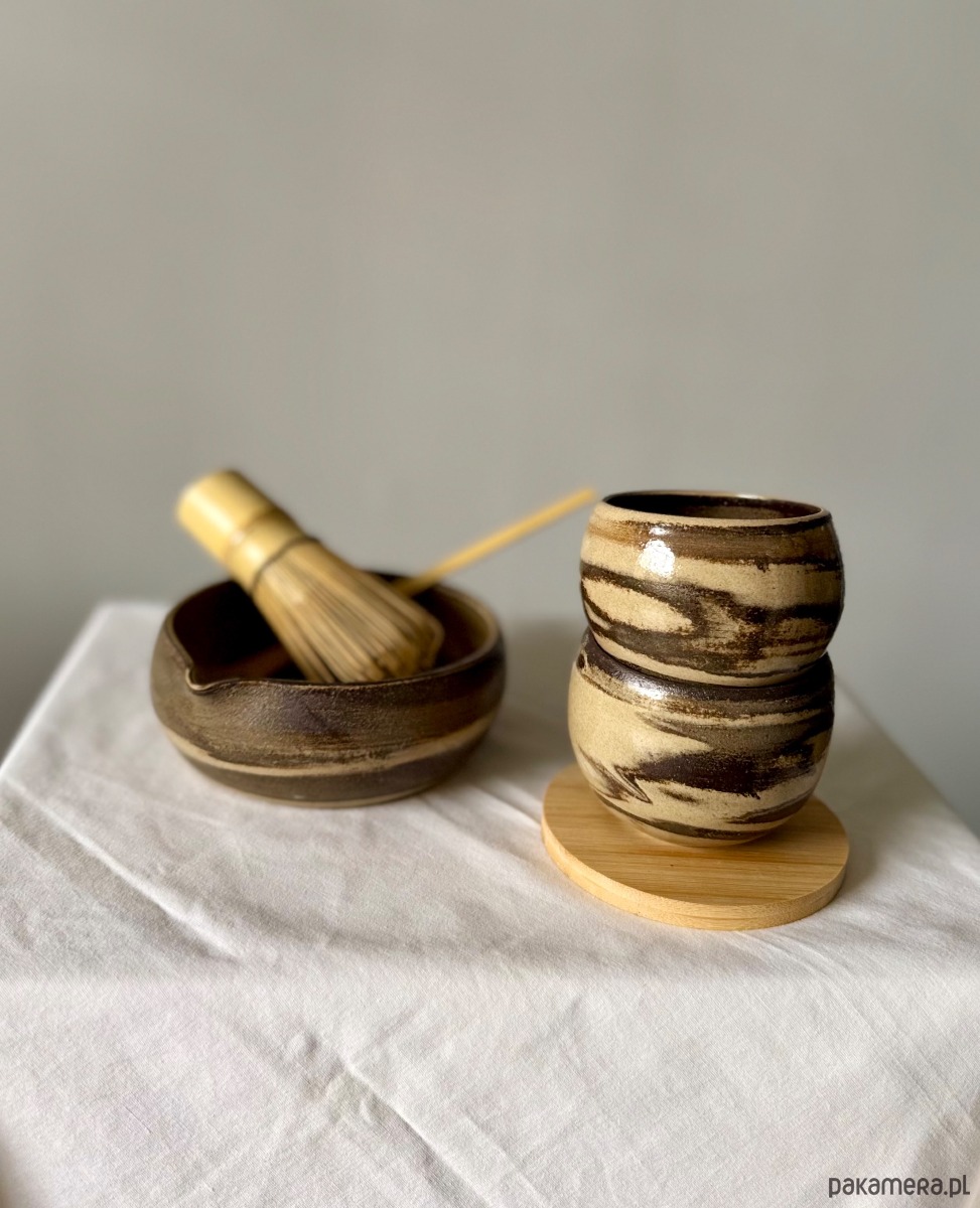 Kamionkowy zestaw do parzenia herbaty matcha o wdzięcznej nazwie Praline. W skald zestawu wchodzi naczynie do rozrabiania proszku z lejkiem i dwie niewielkie czarki ceramiczne. Zestaw zostaw wytoczony na kole garncarskim z dwóch odcieni masy ceramicznej. Gliny mieszały się dopiero w trakcie toczenia, dzięki czemu wyroby uzyskały unikatowy, marmurowy efekt. Naczynia zostały pokryte szkliwem transparentnym, co dodatkowo podkreśliło ich ciepłą, karmelowo-czekoladową kolorystykę. Obłe kształty dodatkowo podkreślają ich smakowity charakter.