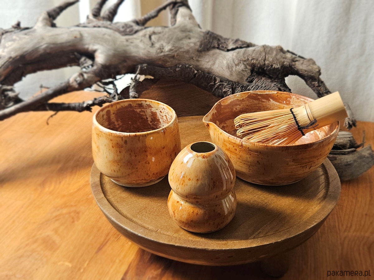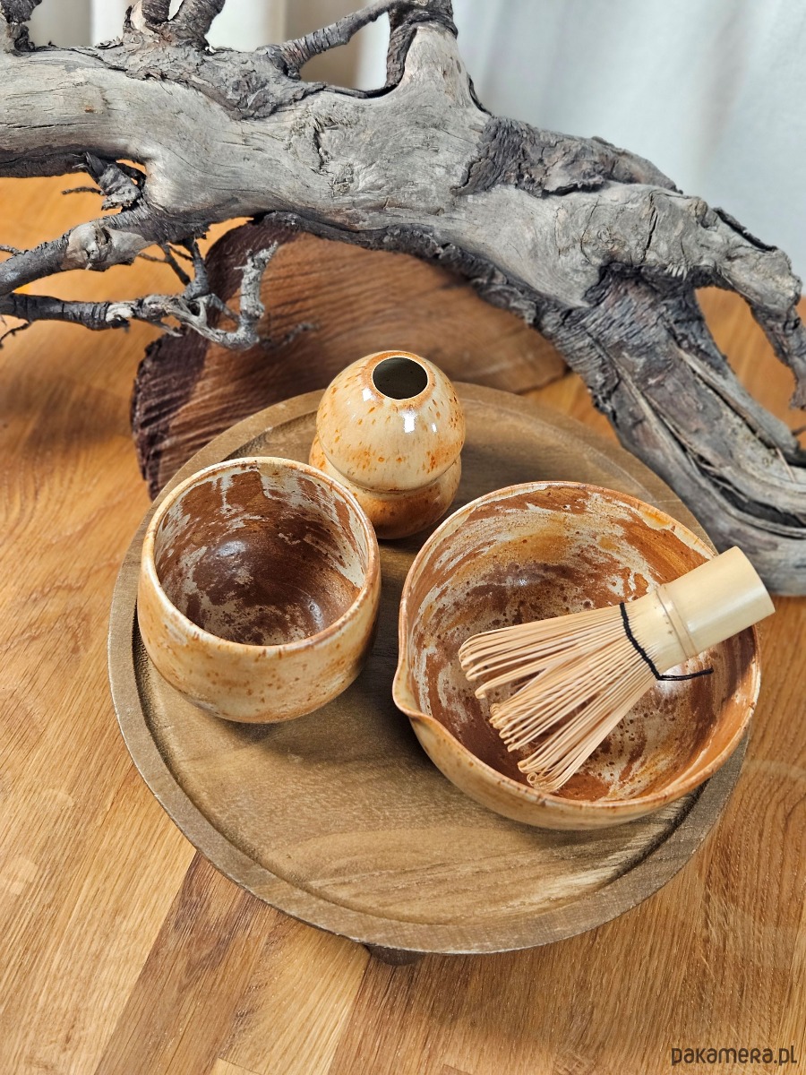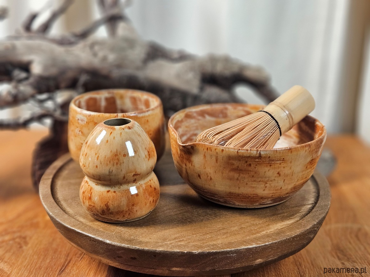 Zestaw do matchy składający się z miseczki do przygotowania napoju, czarki do picia oraz podstawki na miotełkę Chasen, umożliwiającej jej suszenie i bezpieczne przechowywanie.