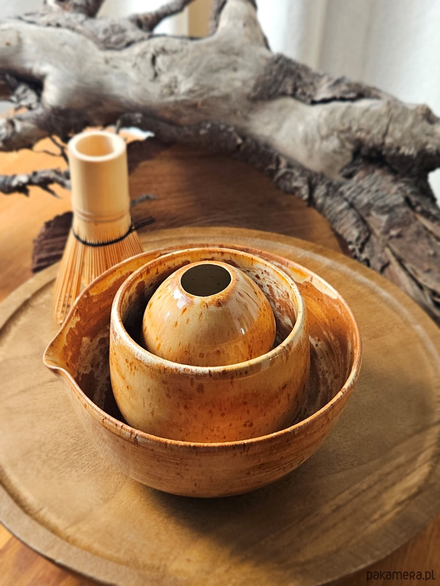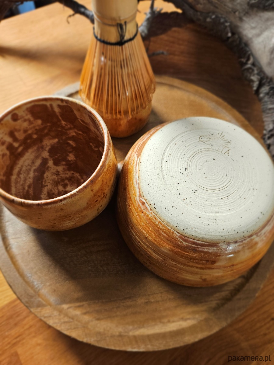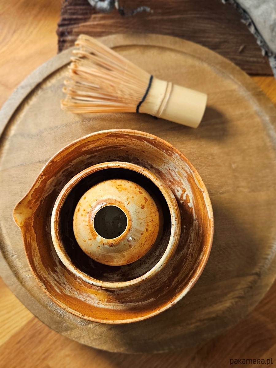 Zestaw do matchy składający się z miseczki do przygotowania napoju, czarki do picia oraz podstawki na miotełkę Chasen, umożliwiającej jej suszenie i bezpieczne przechowywanie.