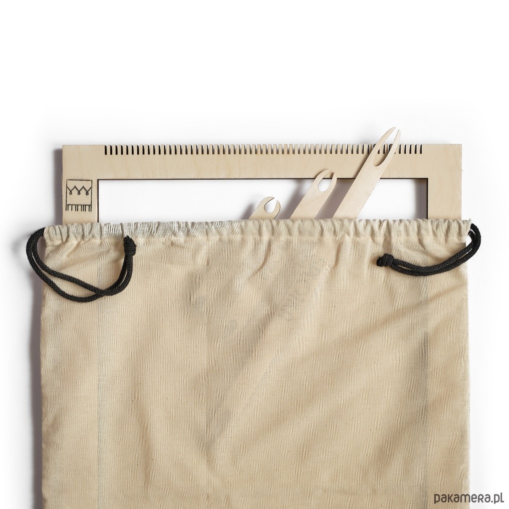 Ramka tkacka a akcesoriami umieszczona jest w worku. Szyłam go sama - stylem frywolnym, ale porządnym ;) Tylko u mnie kupisz zestaw do tkania z workiem. Wszystkie materiały i narzędzia wrzucisz bezpiecznie do jednego worka i nic nie pogubisz.