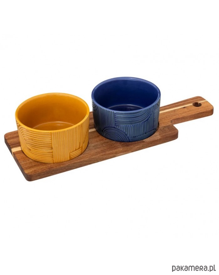 Zestaw do przekąsek. Składa się z akacjowej deski oraz dwóch ceramicznych miseczek z etnicznym wzorem.