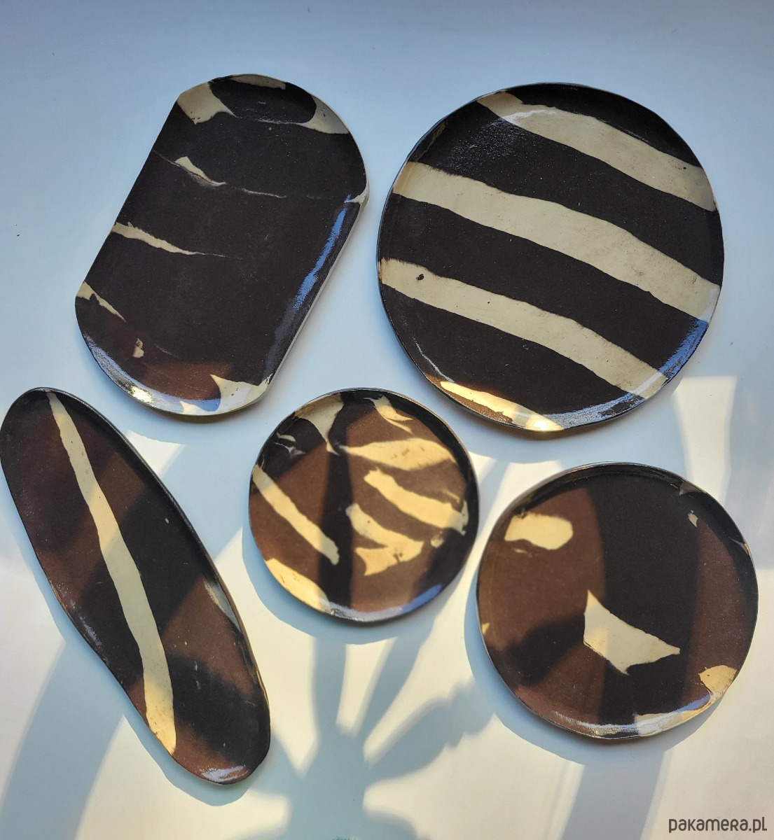 Ręcznie formowany komplet ceramicznych talerzy do serwowania.