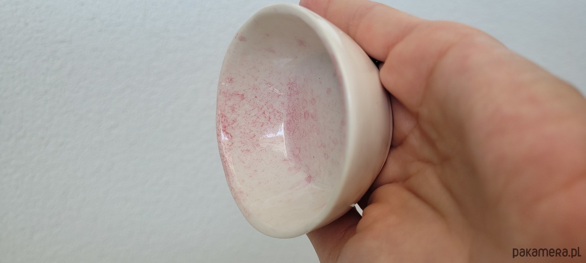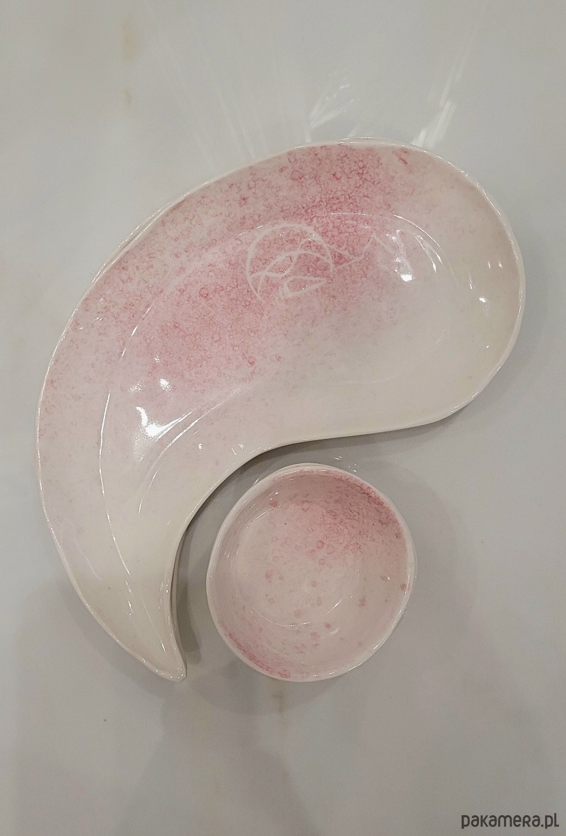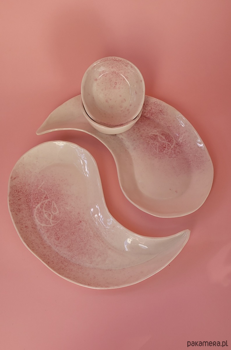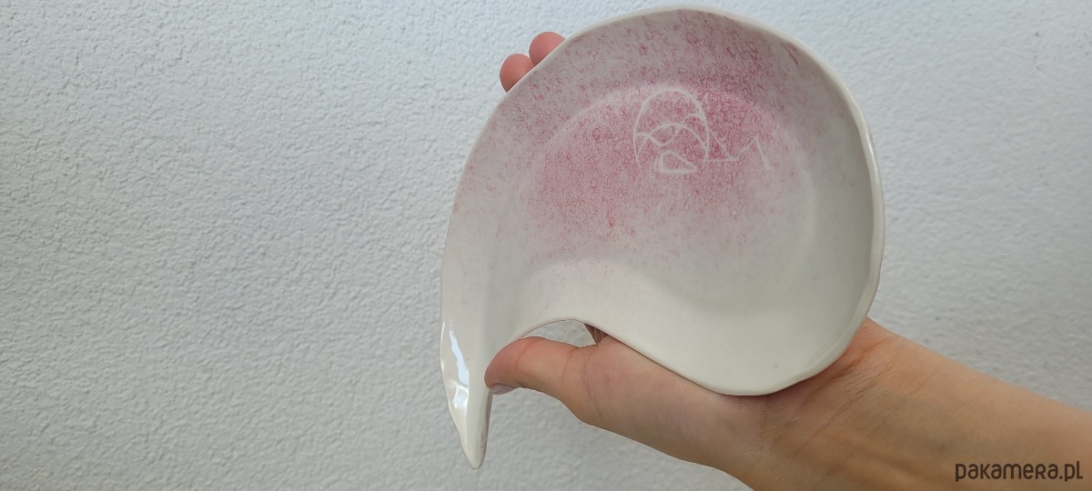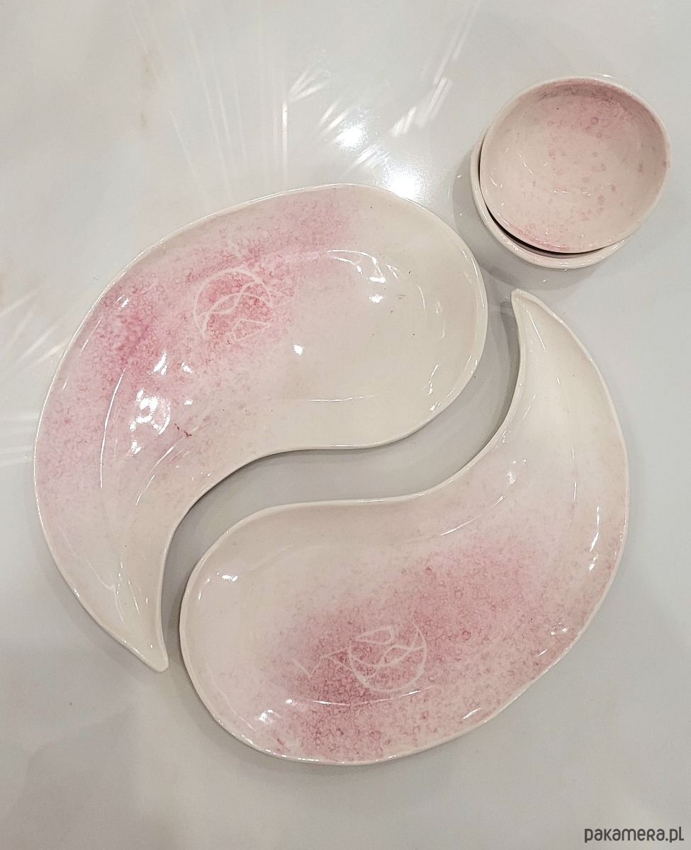 Bardzo lekkiw kolorze białym z lekka poświatą różu i subtelnym wzorem dekoracyjnym.