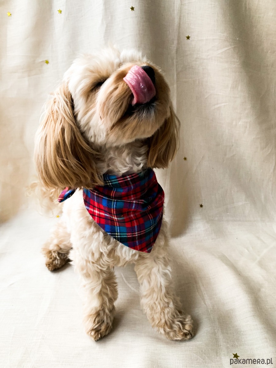 Wymiary bandanki: około 16X27 cm. Chustka mam przedłużone wiązanie, które można zawiązać w kokardkę lub na supełek. Pozwala ono też na dość sporą regulację rozmiaru. Bandanka będzie dobra dla mniejszych psów (shit-zu, maltańczyk, pudel toy, corgi), ale również dla ras średnich.