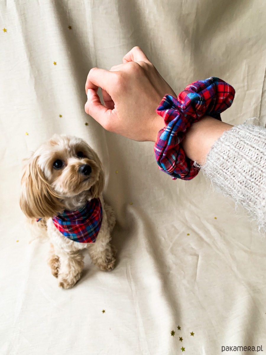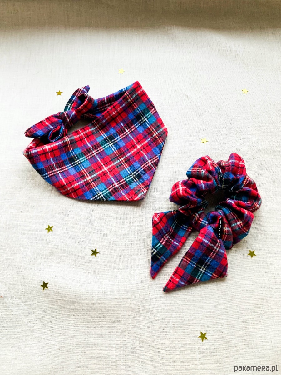Scrunchie z kokardką (ktorą można odwiązać), czyli wyjątkowa ozdoba do włosów oraz bandanka dla psa w ten sam print. Każda psiara pokocha ten świąteczny set w cudowną kraksę uszyty z najwyższej jakości, mięciutkiego, materiału bawełnianego - flaneli.