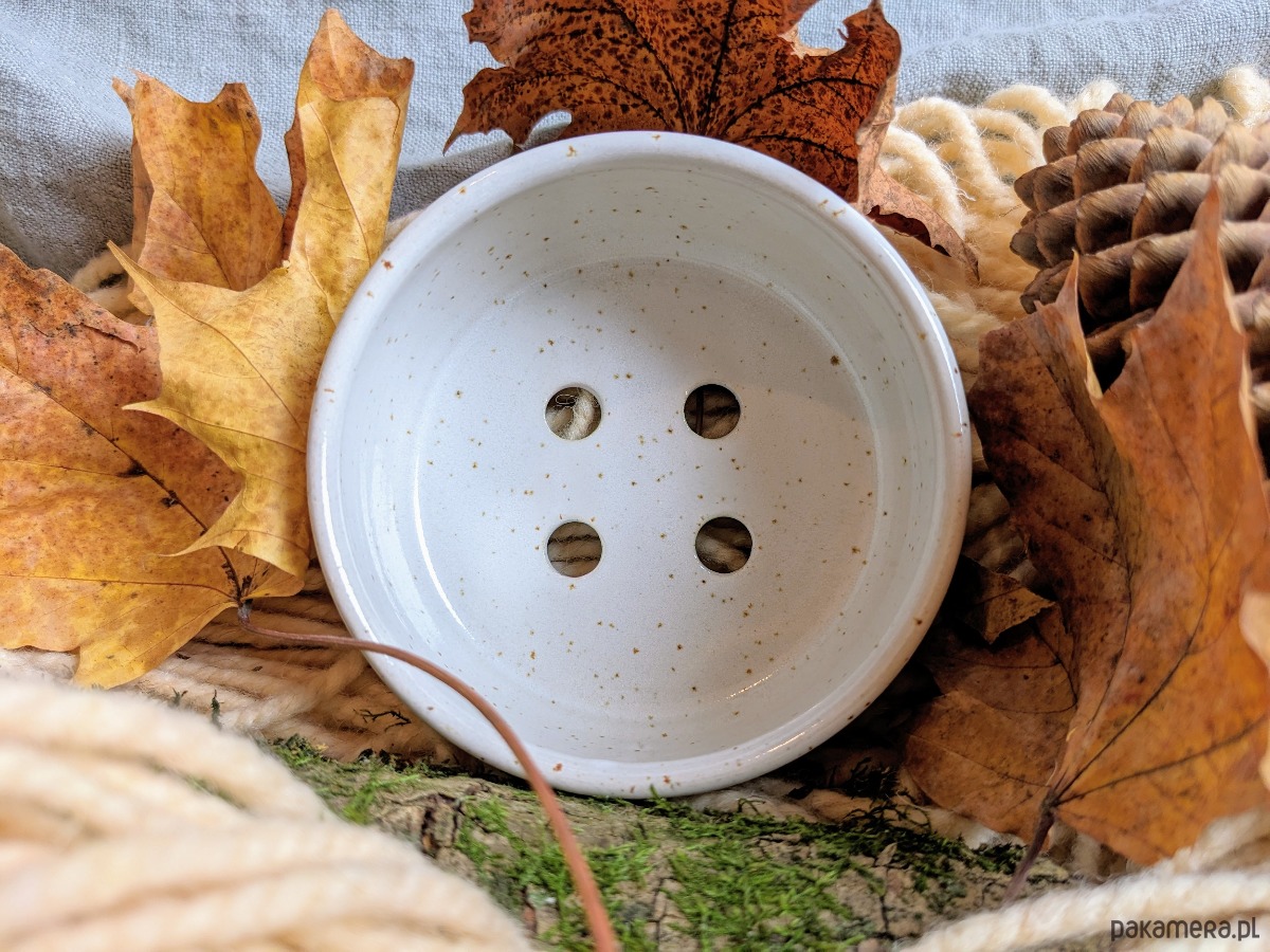 Wymiary: ok 10 cm (średnica) x ok 5 cm (wysokość wraz z nóżkami).