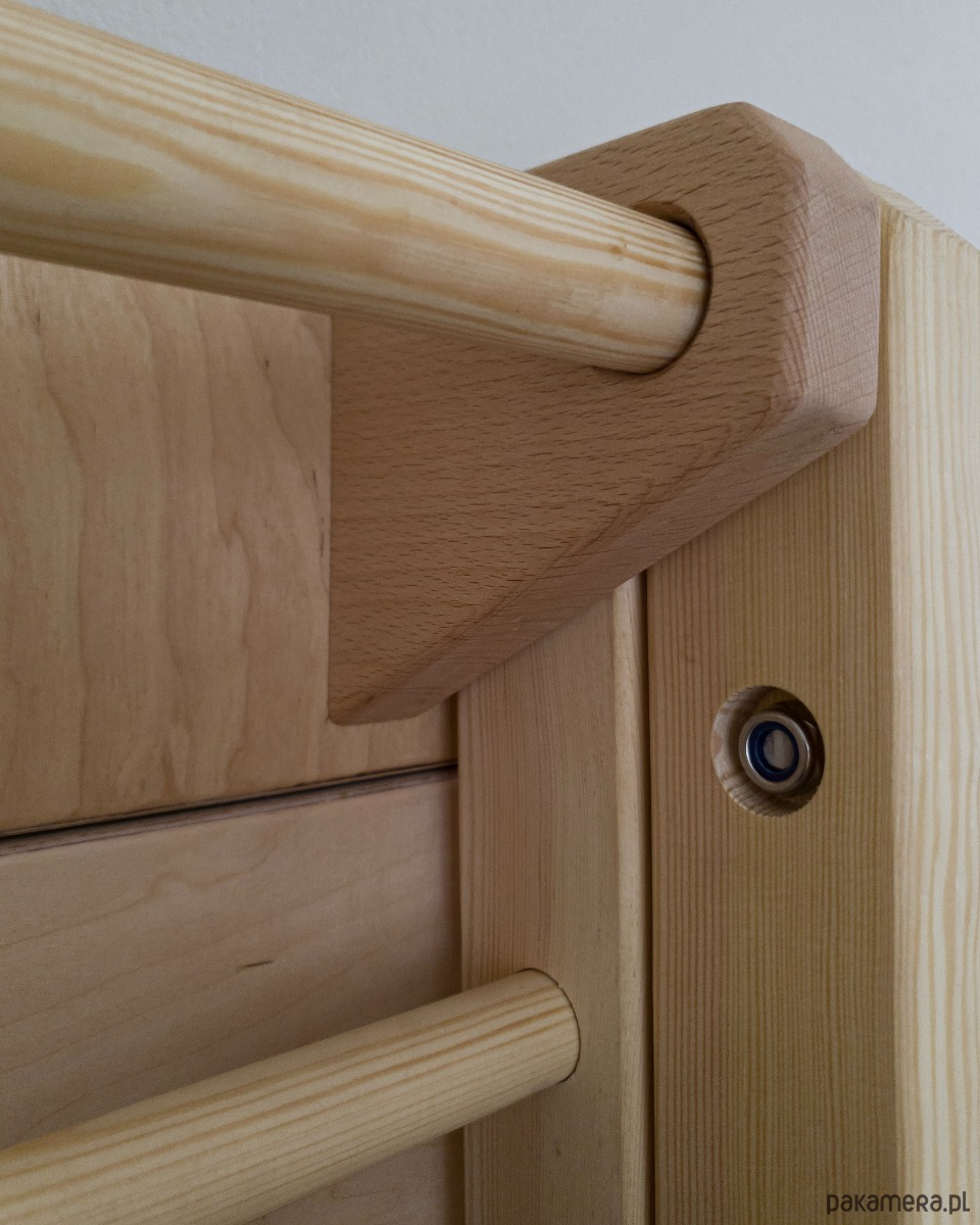 Drabinka mocowana jest na stałe do ściany za pomocą elementu wykonanego ze sklejki przy użyciu kołków rozporowych montażowych.