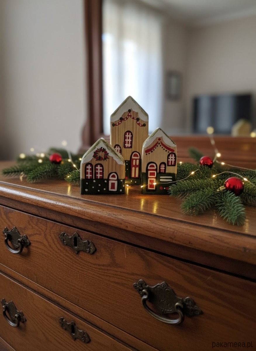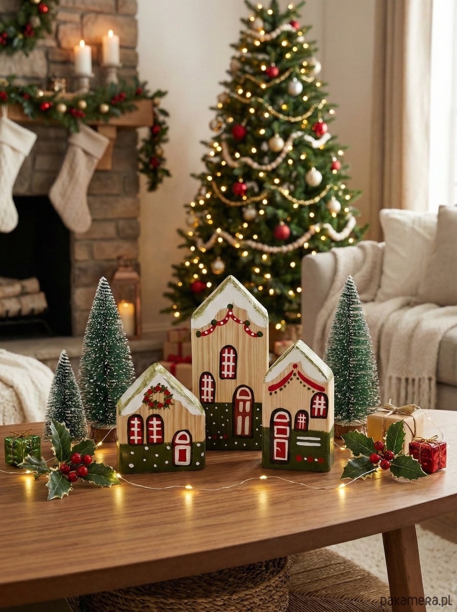 Ręcznie robione domki z drewna iglastego, pomalowane w stylu świątecznym. Każdy produkt jest zabezpieczony specjalną mieszanką zwiększającą wytrzymałość, a na koniec pokrywany lakierem ochronnym.