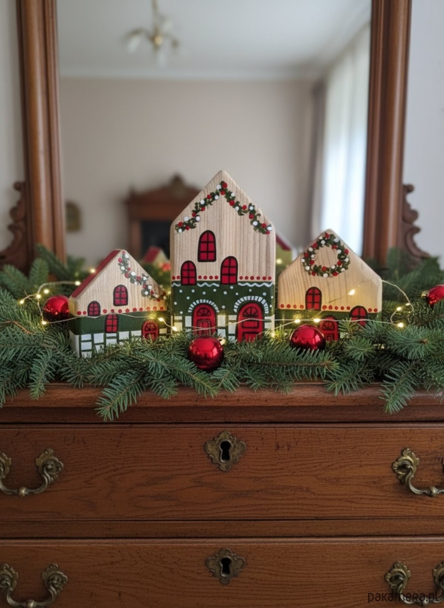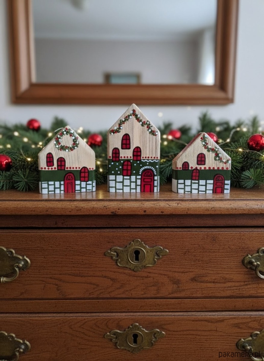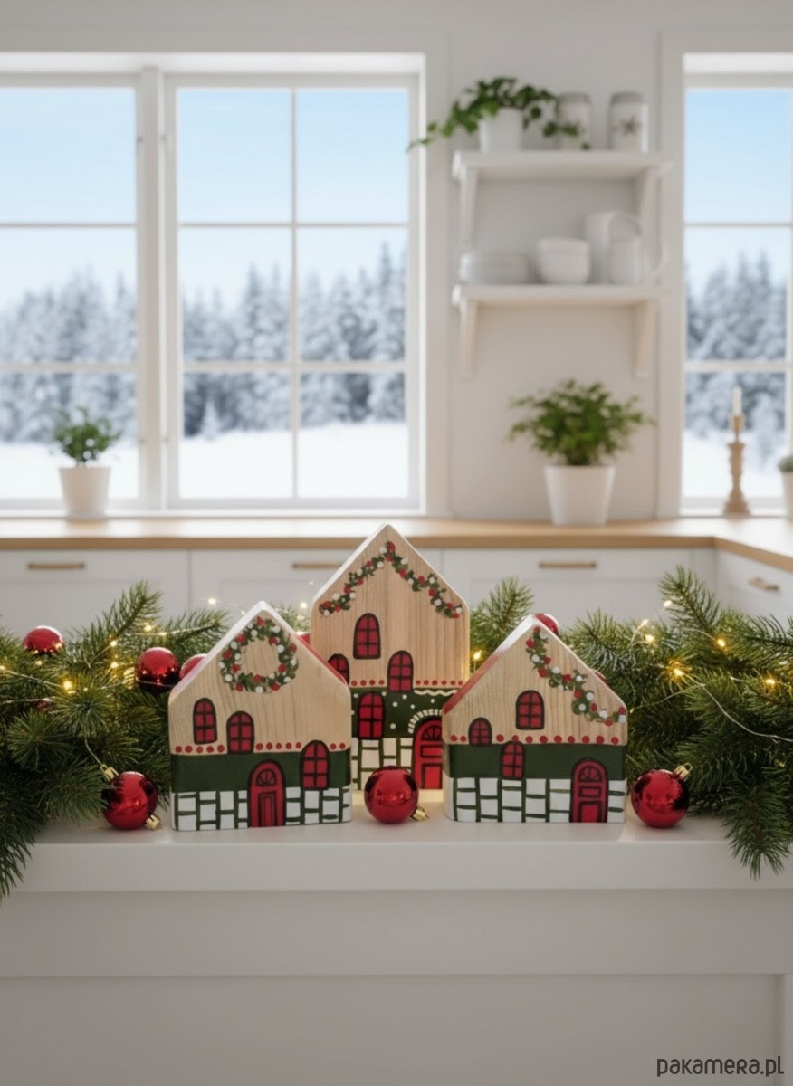 Ręcznie robione domki z drewna iglastego, pomalowane w stylu świątecznym. Każdy produkt jest zabezpieczony specjalną mieszanką zwiększającą wytrzymałość, a na koniec pokrywany lakierem ochronnym.