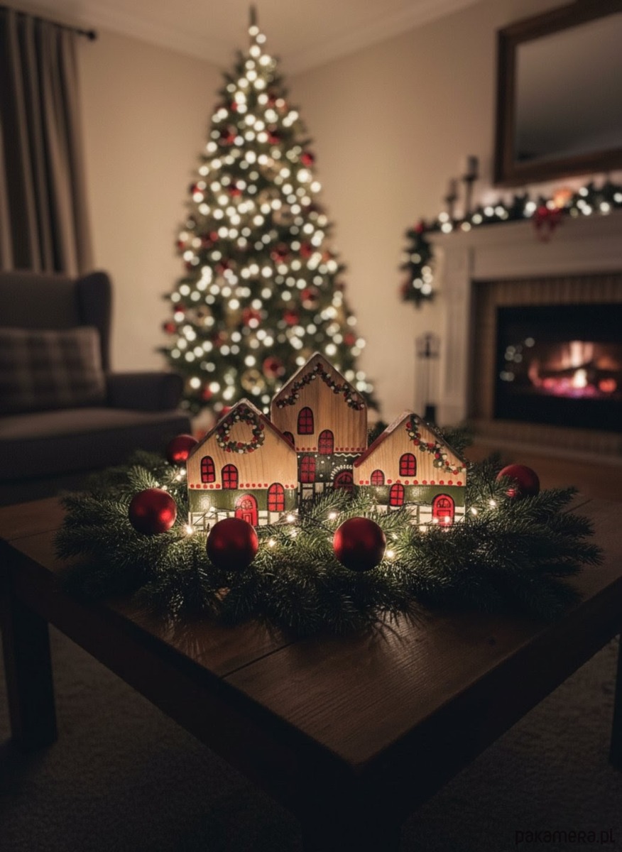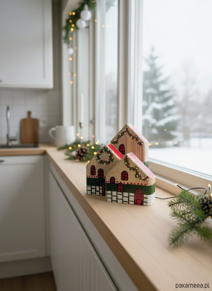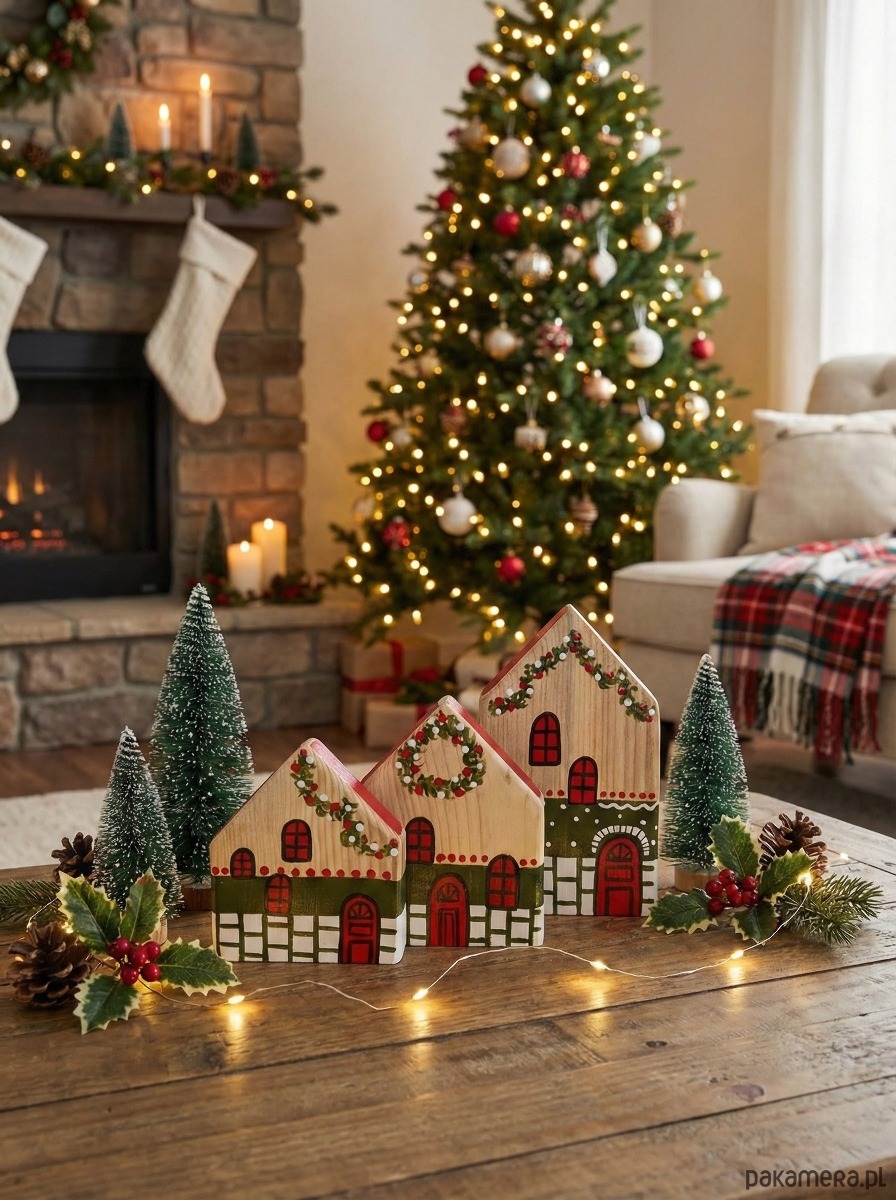 Ręcznie robione domki z drewna iglastego, pomalowane w stylu świątecznym. Każdy produkt jest zabezpieczony specjalną mieszanką zwiększającą wytrzymałość, a na koniec pokrywany lakierem ochronnym.