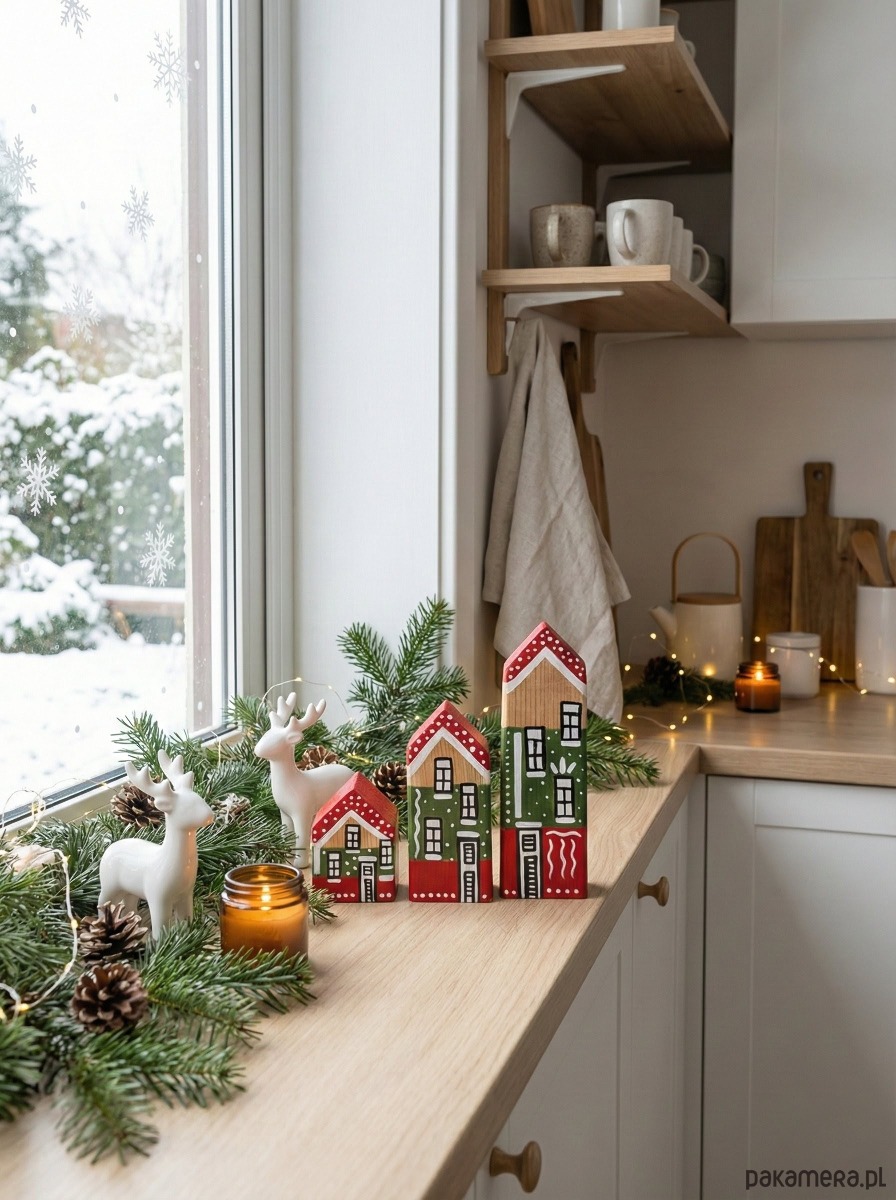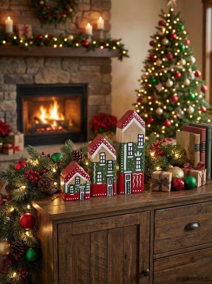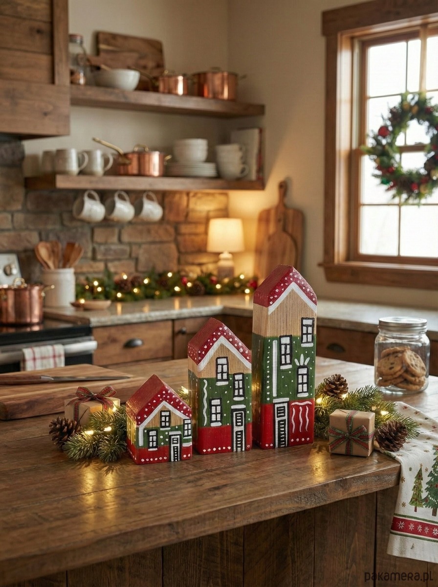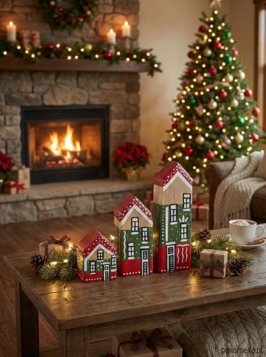 Ręcznie robione domki z drewna iglastego, pomalowane w stylu świątecznym. Każdy produkt jest zabezpieczony specjalną mieszanką zwiększającą wytrzymałość, a na koniec pokrywany lakierem ochronnym.