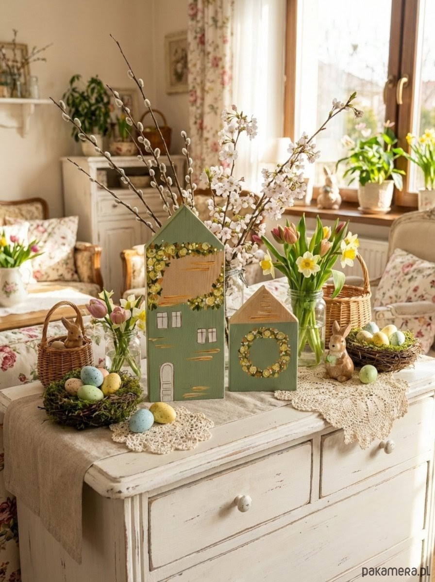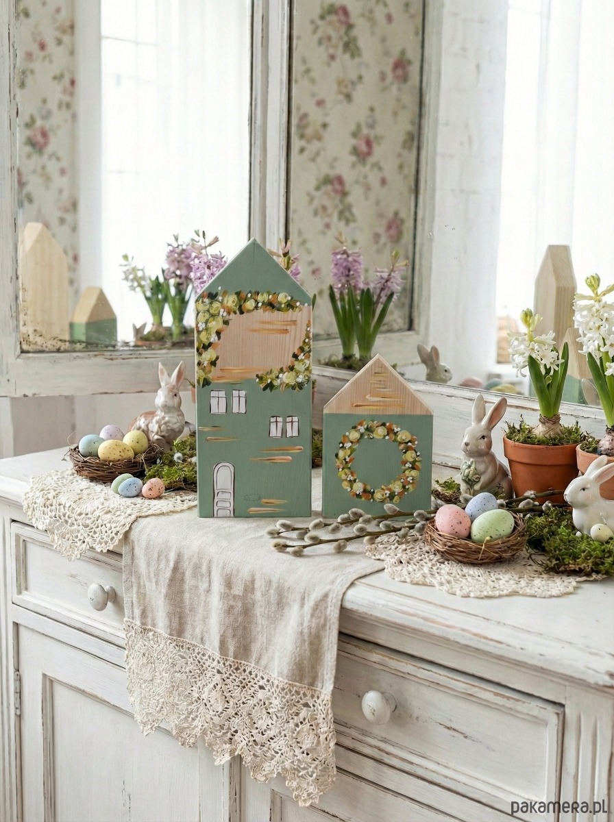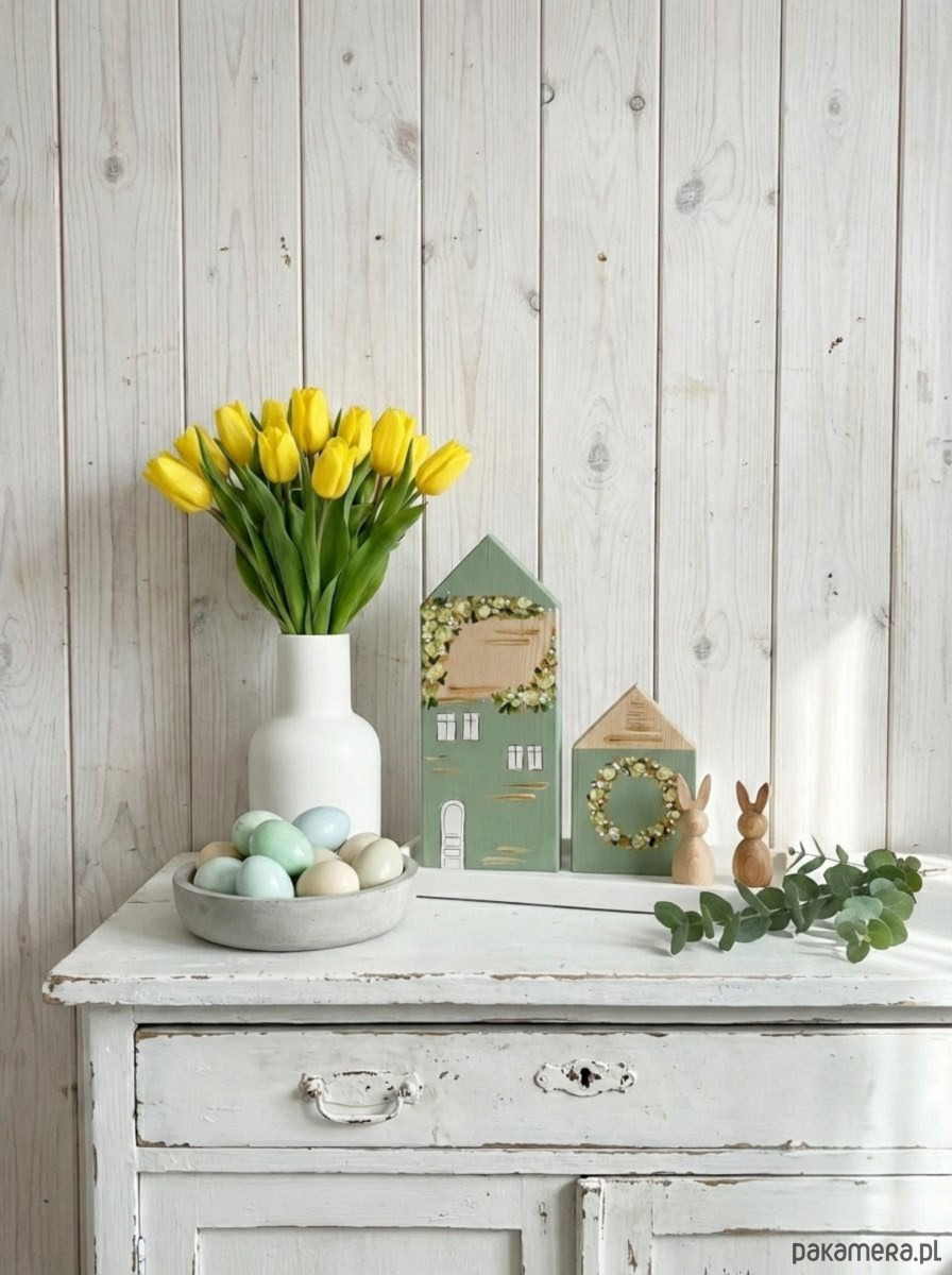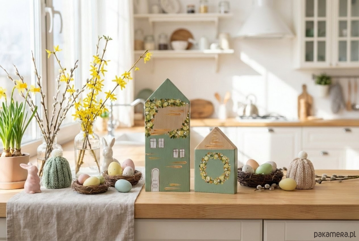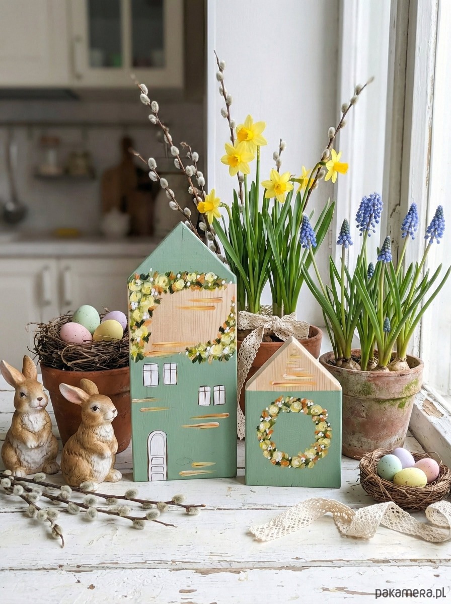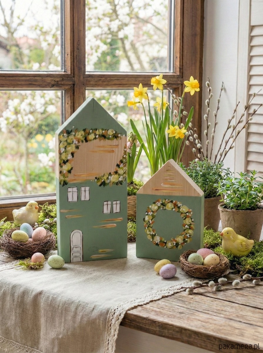 Zestaw Drewnianych Domków Wiosna i Wielkanoc. Ręcznie Malowane Ozdoby
