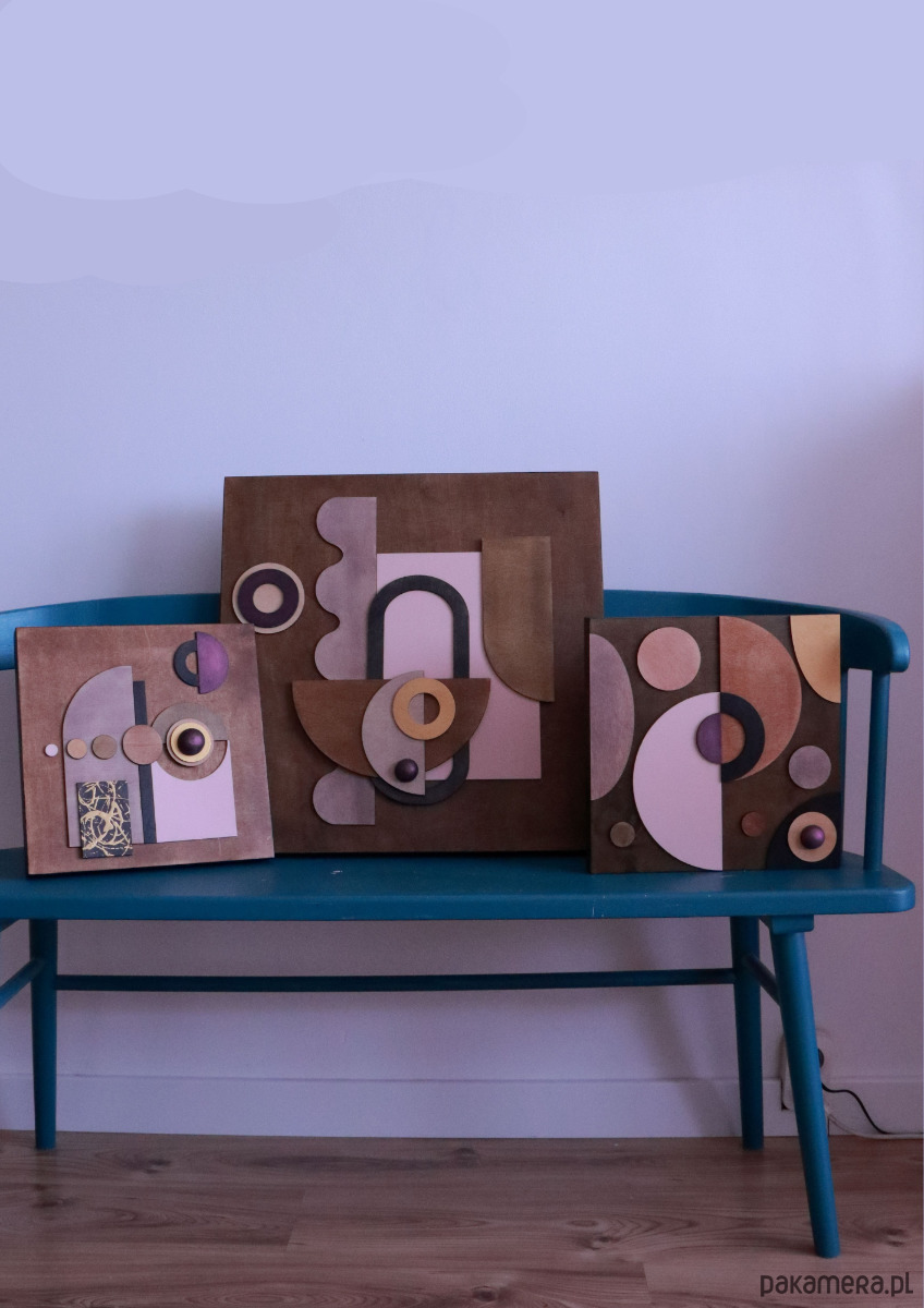 Zestaw sklejkowych obrazów przestrzennych z nutą kolorów.